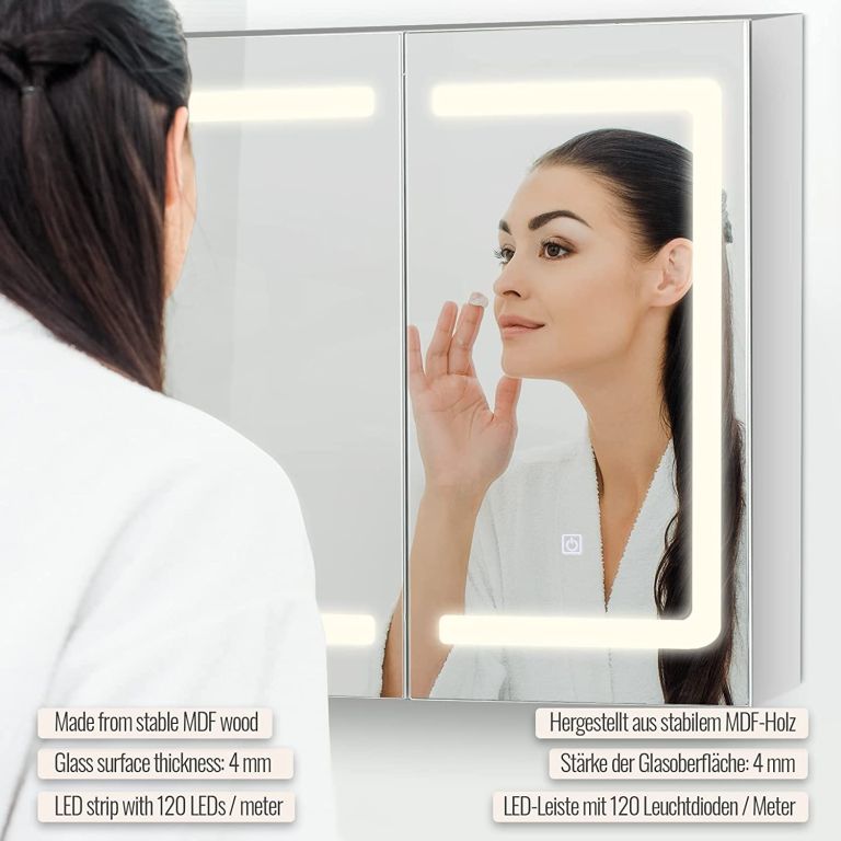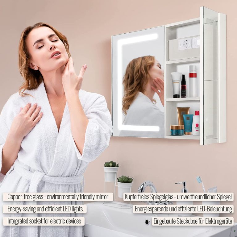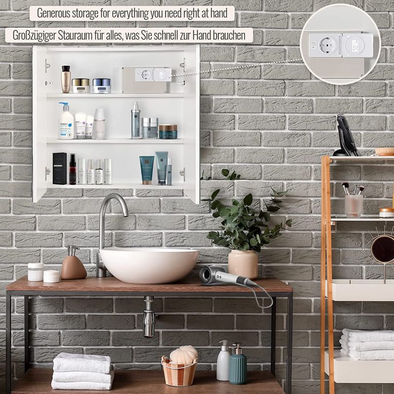 Táto štýlová zrkadlová skrinka má dotykový vypínač, funkciu stmievania a integrovanú zásuvku pre elektrické zariadenia.