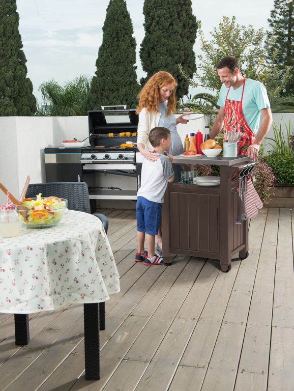 Mobilná skrinka, ktorú oceníte predovšetkým pri grilovaní! Priestranná skriňa s dvojitými dverami vybavená funkčnou nerezovou doskou a praktickou rukoväťou s háčikom na uteráky, ktorá bude dobre fungovať pri dôležitých rodinných stretnutiach na terase alebo na záhrade.