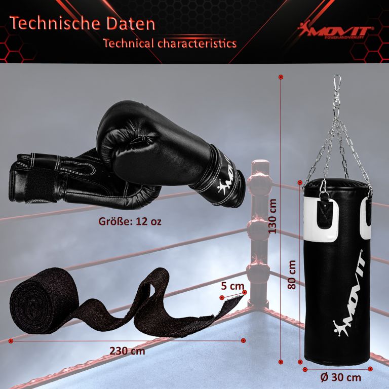 Bezpečná a robustná oceľová reťaz s päťbodovým zavesením pre bezpečné uchytenie, nylonové slučky pre upevnenie reťaze sú navyše zaistené nitmi. Boxerské rukavice majú fixáciu palca, sú polstrované penou a vybavené otvormi na vzduch a suchým zipsom.