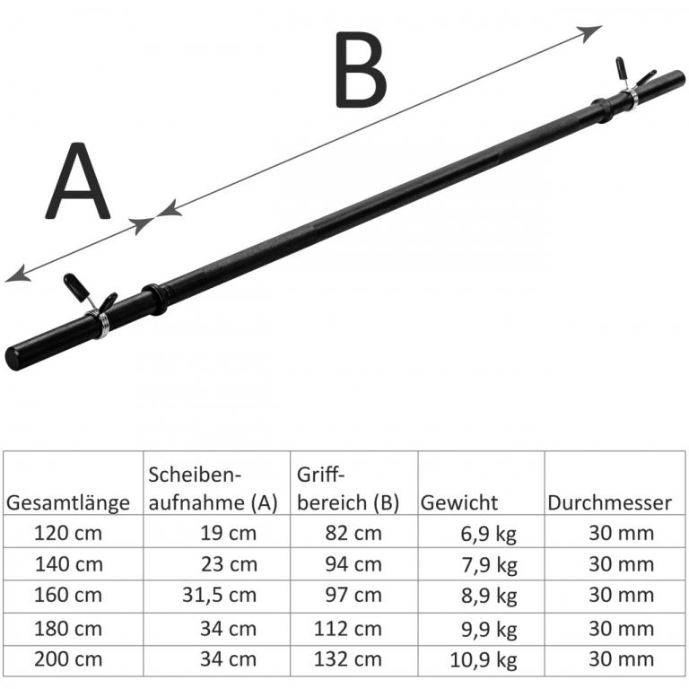 Profesionálna posilňovacia činka MOVIT®. Hviezdicové uzávery zaisťujú, že závažia ležia vždy pevne a bezpečne na činke. Rovnako zabraňujú nepríjemnému chrasteniu váhových kotúčov. Aby sa zabránilo skĺznutiu rúk počas tréningu, sú úchopné body na tyči s krížovým ryhovaním. Činka má dva nezničiteľné lichobežníkové závity - najbezpečnejší spôsob pripevnenia závažia. S priemerom 30 mm má dlhá tyč štandardnú veľkosť, čo zaisťuje, že všetky komerčne dostupné váhy sú bezpečne pripevnené.