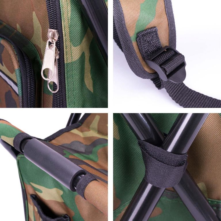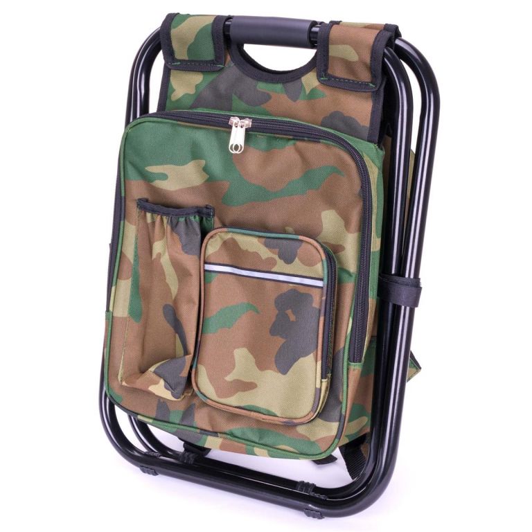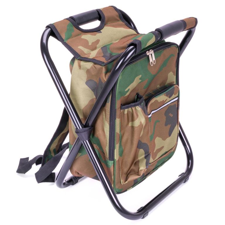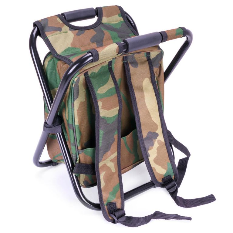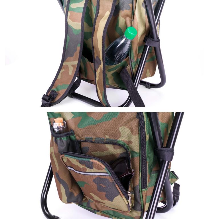 Turistický batoh v maskovacej farbe so skladacou stoličkou, chladiacou taškou, držiakom na nápoje a vonkajšími vreckami.