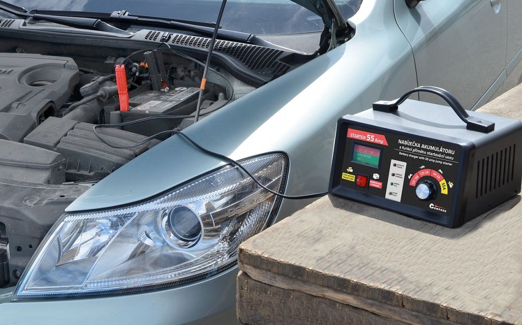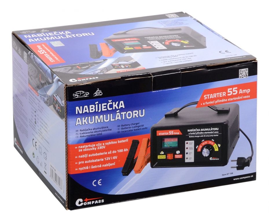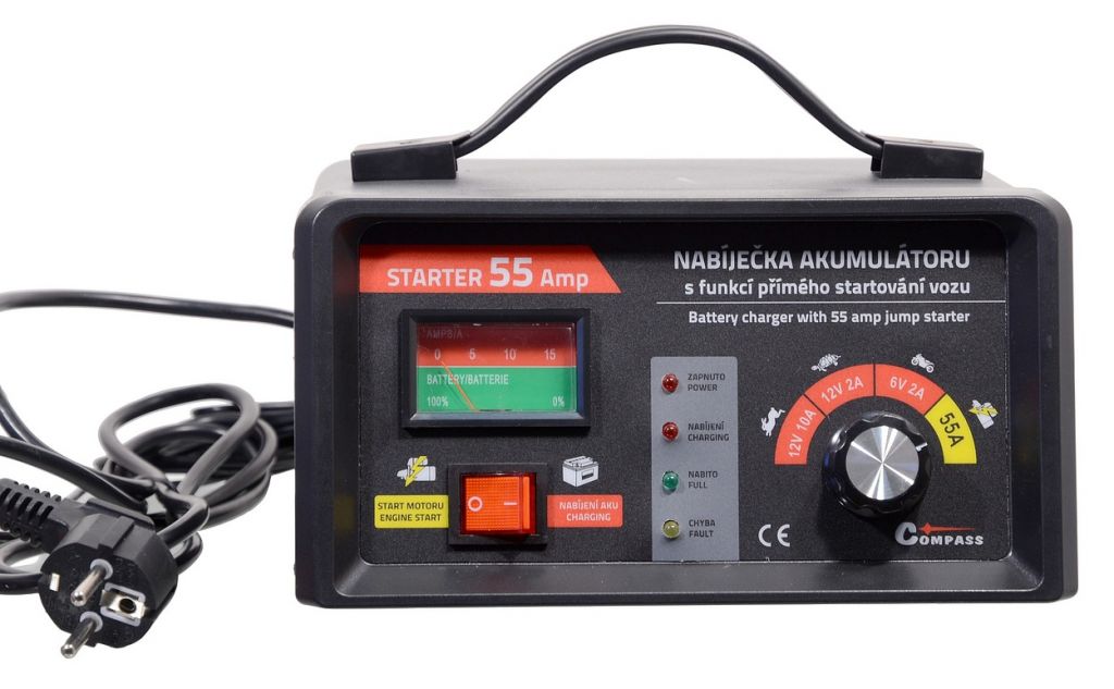 Nabíjačka akumulátorov 6 / 12 V 10 A s napájaním 230 V as funkciou priameho štartovania vozidla. Funkcia STARTER 55 Amp umožňuje naštartovať vozidlo s vybitou batériou tak, ako kedy bolo štartované pomocou štartovacích káblov z iného vozidla. Nabíjačka akumulátora umožňuje nabíjať rýchlo alebo pomaly (veľmi šetrne) autobatérie 12 V aj 6 V a je vhodná pre kapacitu batérie až 100 Ah. Je určená na nabíjanie olovených akumulátorov.