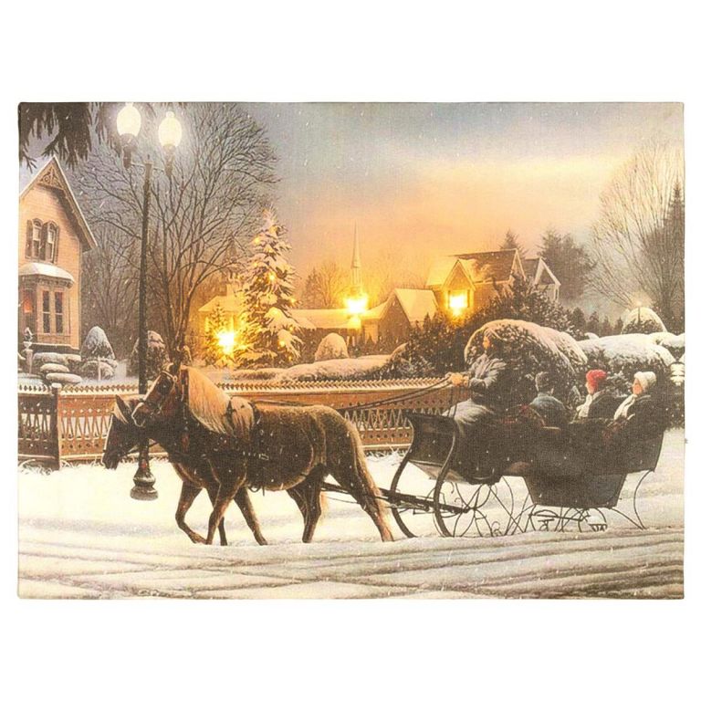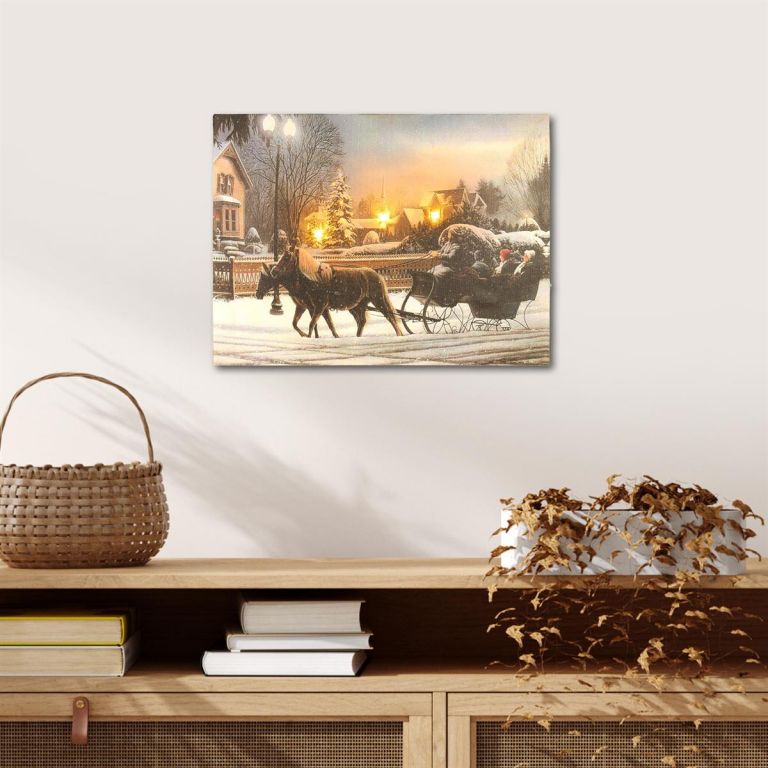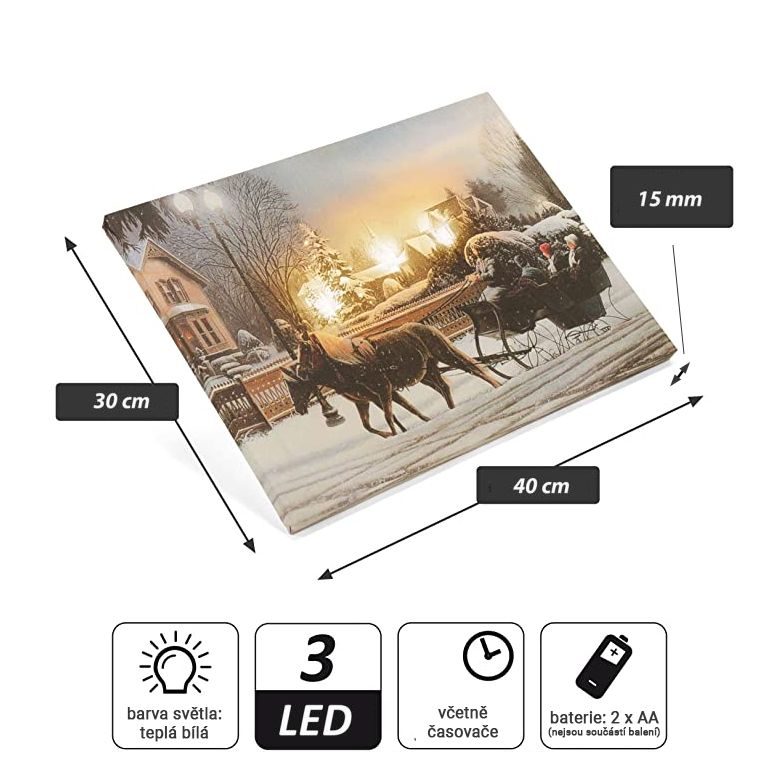 Obraz s motívom vianočných saní vrátane LED diód vykúzli príjemnú náladu a útulnú atmosféru vo vašom obývacom priestore na akomkoľvek mieste. Dva kone tiahnu otvorené sane súmrakom po zasneženej ulici. Pouličné lampy ohrievajú studený vzduch. Vďaka napájaniu na batérie nemáte žiadny nepríjemný kábel a môžete zavesiť svetelný obraz kamkoľvek. Zadná časť je pripravená na zavesenie. Vysoko kvalitná fototlač na plátne je nielen krásnou dekoráciou ale aj skvelým darčekom.