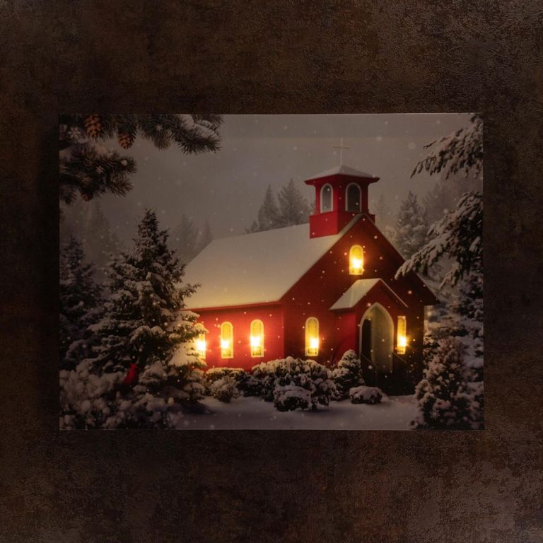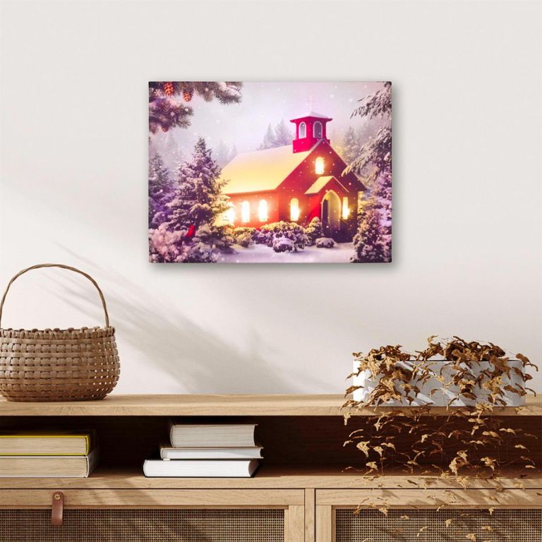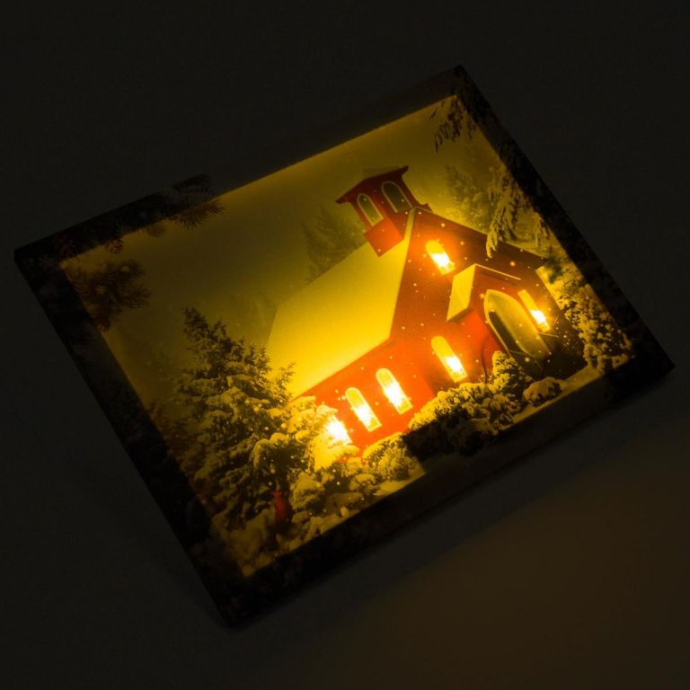 Nástenná maľba- Zasnežená kaplnka, 6 LED, 30 x 40 cm