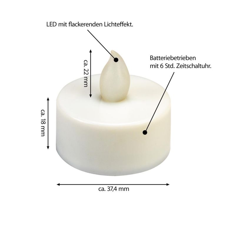 Elektrické čajové sviečky s priemerom 37,4 mm rozžiaria Váš domov a vďaka teple bielemu svetlu navodia príjemnú atmosféru bez rizika požiaru.