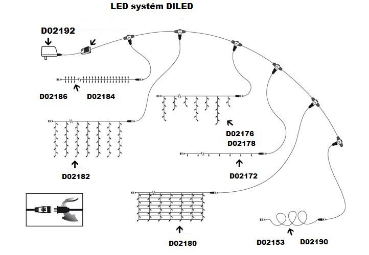 Reťaz je vhodná pre vonkajšie aj pre vnútorné použitie. Na jeden napájací adaptér môžete napojiť až 2 000 diód v rámci diLED systému. Napájecí adaptér nie je súčasťou tohto balenia, môžete ho objednať pod katalógovým číslom D02192.