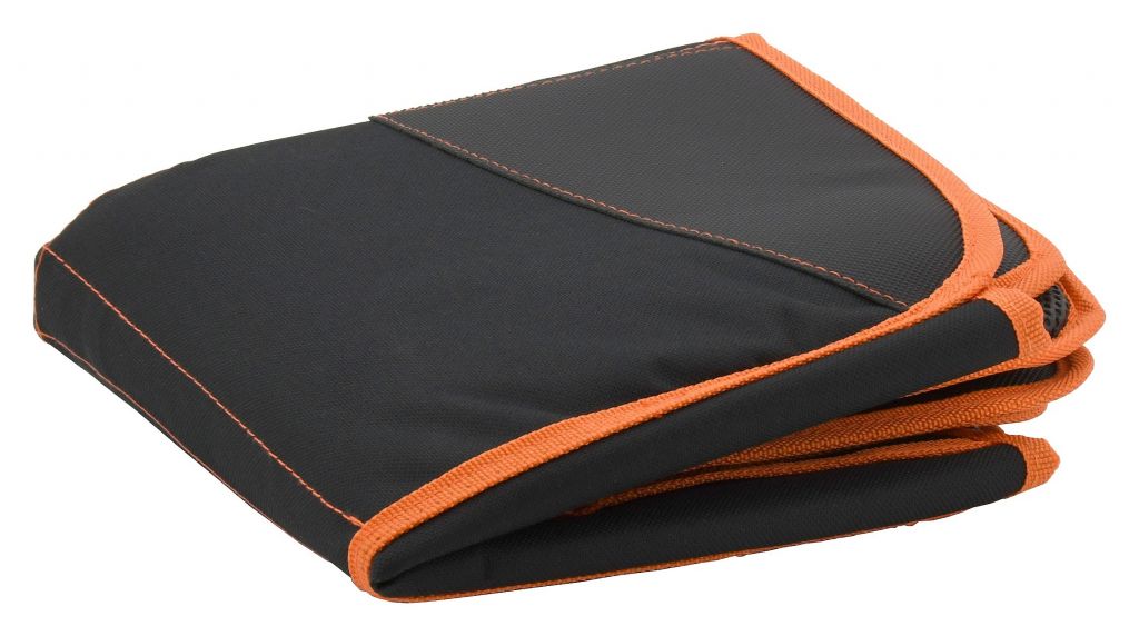 Praktický ochranný poťah s rozmermi 48 x 83 cm zhotovený z odolného polyesteru, obšitého oranžovým lemom.
