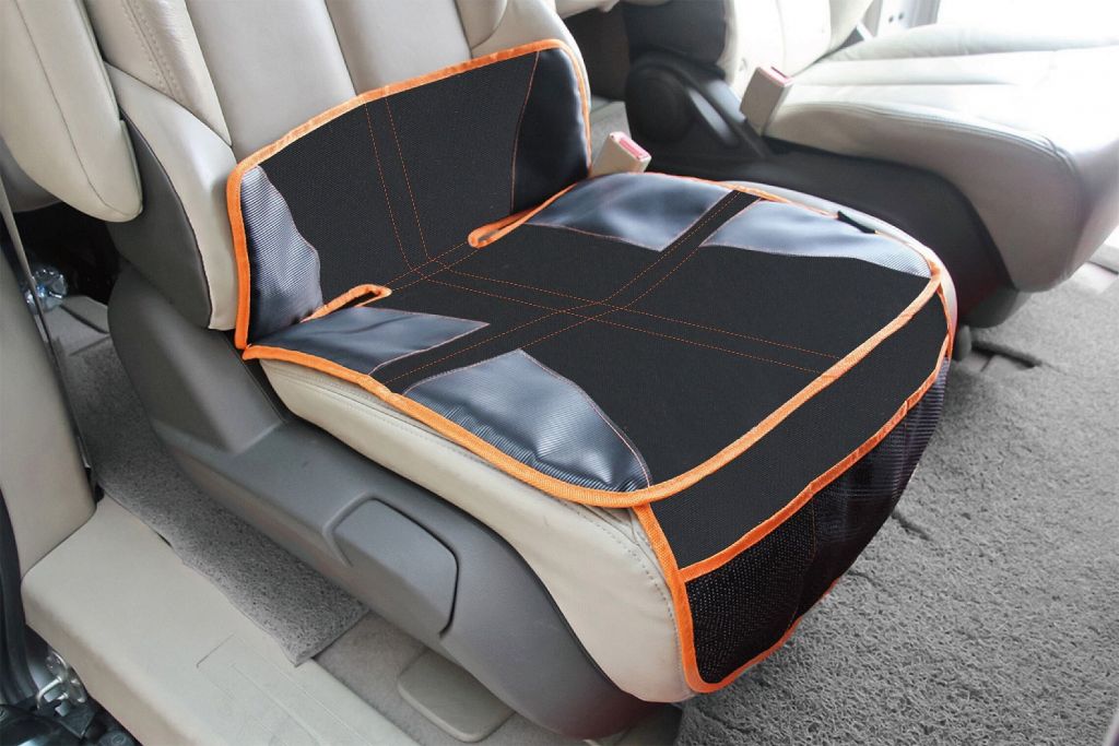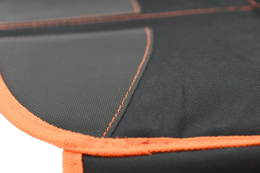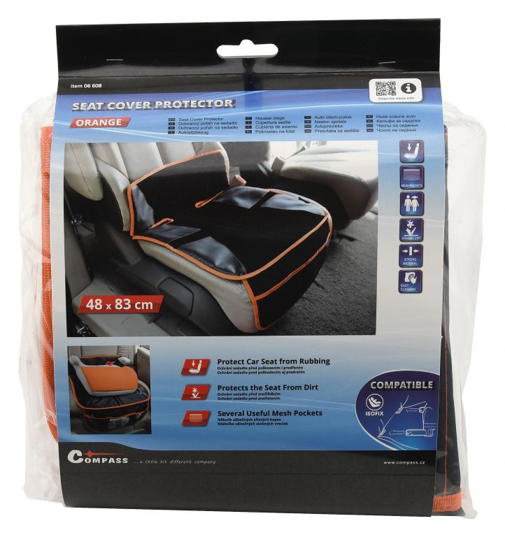 Praktický ochranný poťah s rozmermi 48 x 83 cm zhotovený z odolného polyesteru, obšitého oranžovým lemom. Spodná vrstva je vďaka perforácii priedušná a zároveň drží poťah na mieste. Poťah je zložený z chrbtovej časti a sedacej časti, ktoré sa uplatnia obzvlášť pri použití detského podsedáku, či detskej autosedačky, kde chráni originálny poťah sedačky pred zničením a znečistením. Ďalej je opatrený praktickým, predným panelom, na ktorom je našitý systém sieťových vreciek, pre rôzne potreby a veci. Predný panel chráni prednú časť sedačky pred znečistením a zničením.