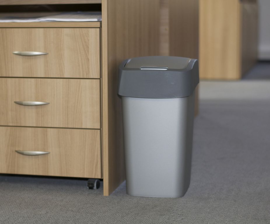 Praktický odpadkový koš Flipbin Curver v šedostříbrné a šedé barvě. Dva stupně otevření víka. Pro drobnější odpad lze použít první stupeň tzv. malé otevření na 78°, pro větší odpad velké otevření na 100°. Tento systém pomůže udržet víko čisté.