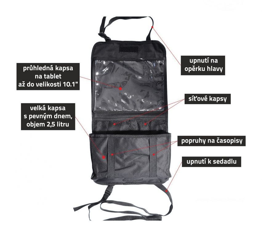 Organizér na pripevnenie na zadnú stranu predného sedadla. Upevnenie v hornej časti je pomocou popruhov za opierku hlavy,a v spodnej časti popruhamy z