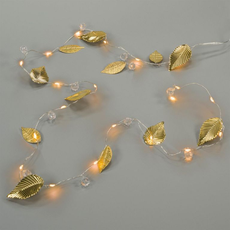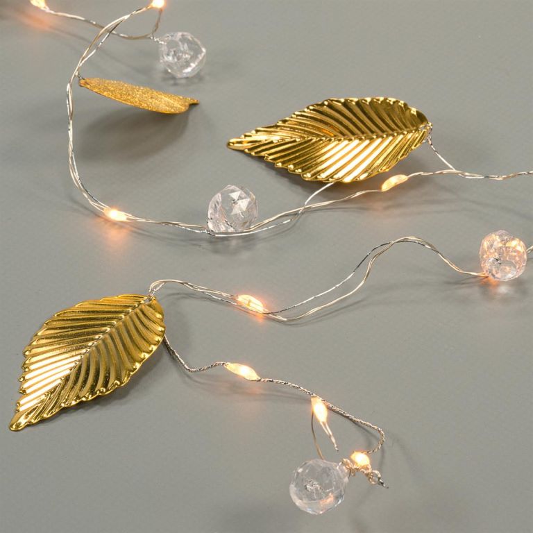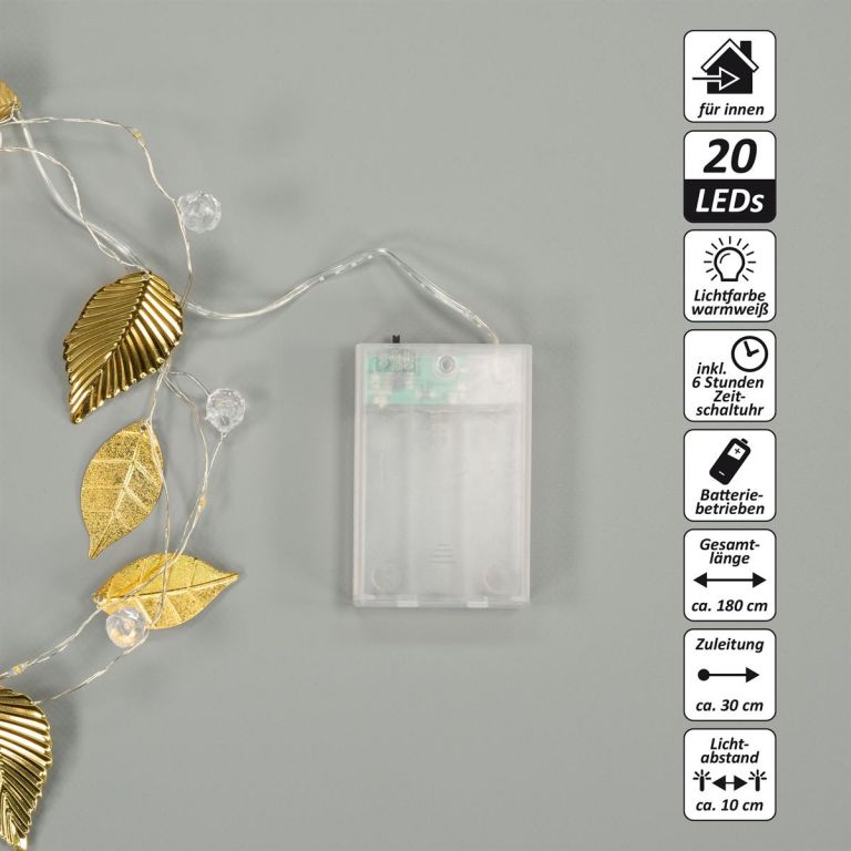 Párty a slávnostné osvetlenie - tieto rozprávkové svetlá s priehľadnými plastovými korálkami a lístkami v zlatej farbe sú vhodné pre každú slávnostnú príležitosť. Nastavte si vlastné svetelné akcenty po celý rok a vyzdobte si dom, zimnú záhradu alebo spoločenskú miestnosť. Možnosti dizajnu sa neobmedzujú. Pomocou časovača môžete rozhodnúť, kedy chcete osvetlenie zapnúť. Voľne voliteľná funkcia časovača alebo nepretržitého svietenia.