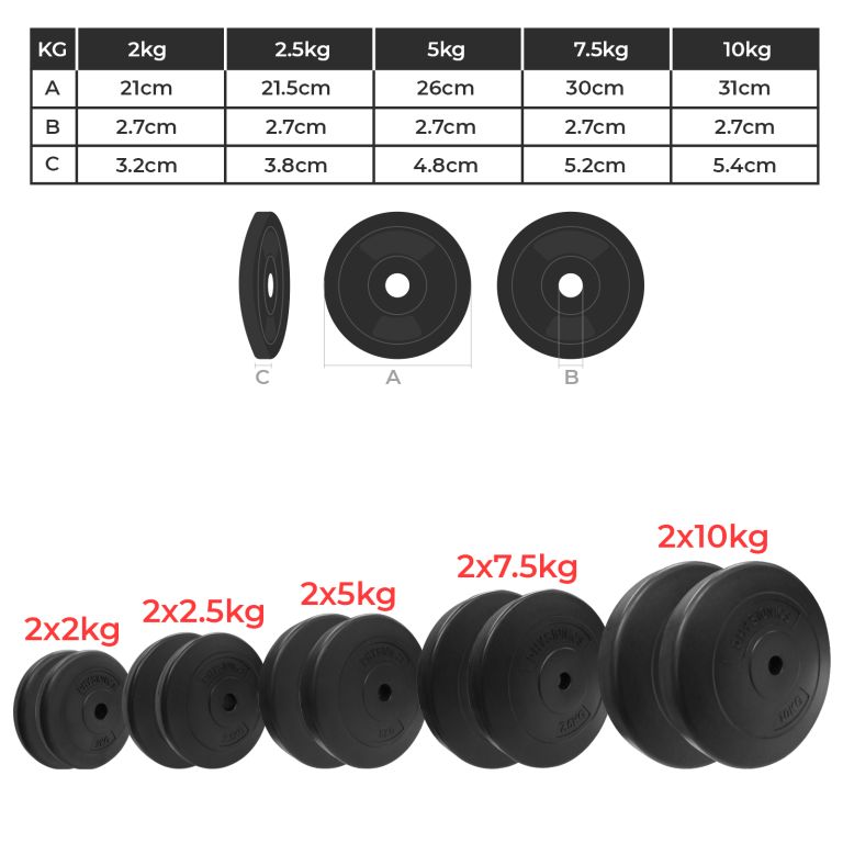 Záťažové dosky v spojení s vhodnou posilňovacou tyčou umožňujú vykonávať rôzne silové cviky, ktoré vytvarujú hornú aj dolnú časť tela. Závažia sú potiahnuté odolným plastom bezpečným pred poškodením Vašej podlahy, a obmedzuje cinkaniu kovu. Zvážte svoje individuálne potreby a schopnosti a prispôsobte si tréning. Môžete si zakúpiť naše ďalšie fitness produkty a prispôsobiť ich záťažovým doskám.