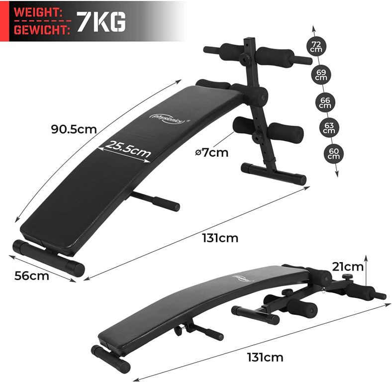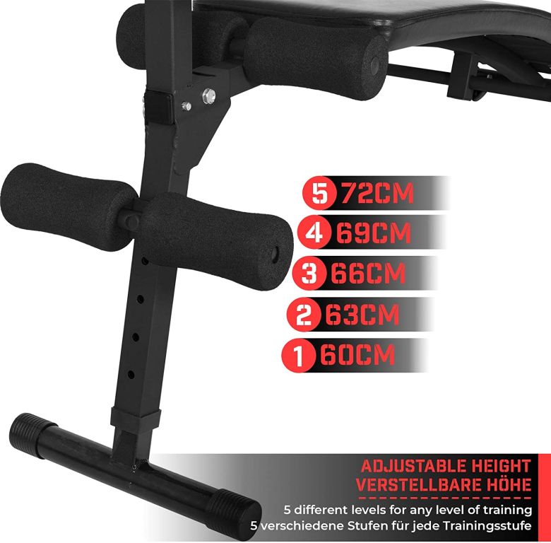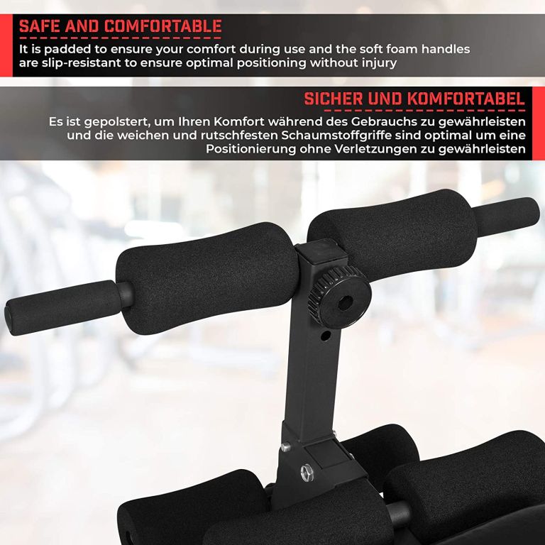 Ak chcete zvýšiť účinnosť cvičenia, upravte sklon lavičky Sit Up. Ak trenažér na cvičenie brušných svalov raz nepotrebujete, zložte ho a uložte, aby ste ušetrili miesto. Túto modernú tréningovú lavicu vyrobenú z ocele možno zaťažiť až približne 120 kg. Veľká plocha na ležanie bola potiahnutá imitáciou kože a je mäkko polstrovaná. K fixácii nôh sú pripojené štyri protišmykové penové valčeky, ktoré poskytujú optimálnu oporu pre vaše nohy.