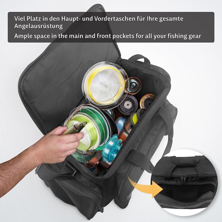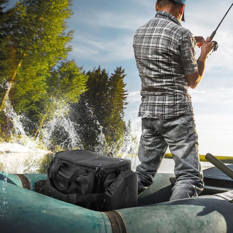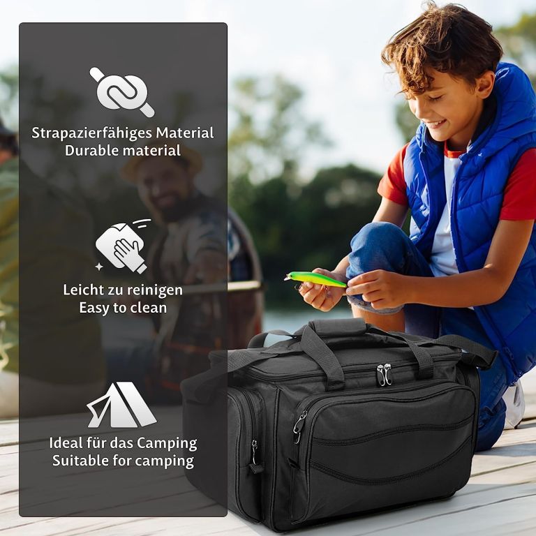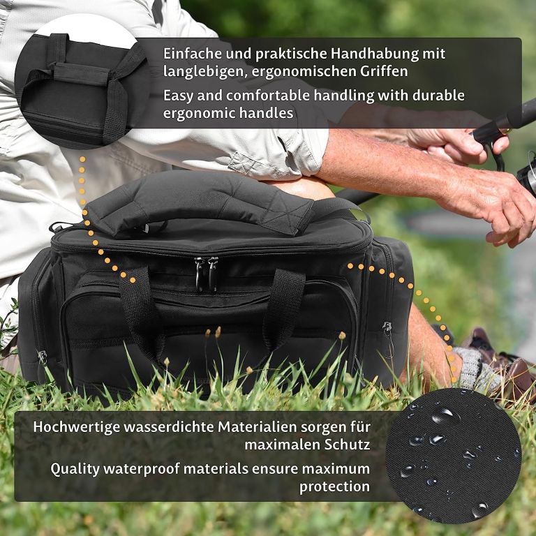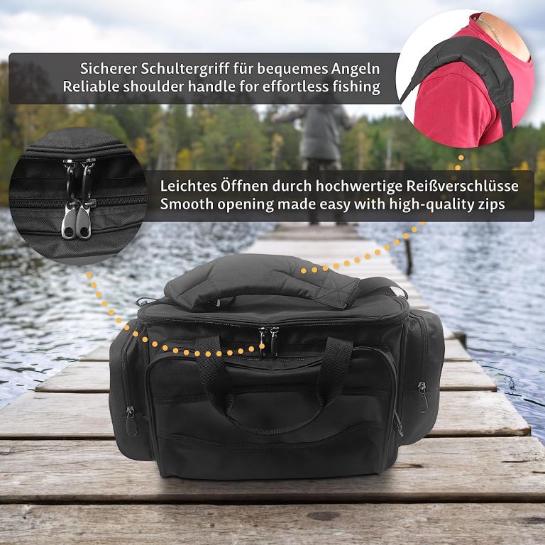 Táto praktická rybárska taška ponúka dostatok priestoru pre všetko, čo si pri rybolove potrebujete vziať so sebou. Kŕmenie, nástrahy, boxy s rezervnými háčikmi, závažia, plaváky a mnoho ďalšieho sú uložené, dobre triedené a v prípade potreby pripravené na okamžité použitie. Robustný a vodotesný materiál vám pomôže, aby obsah tašky zostal chránený aj pred dažďom a striekajúcou vodou. Niekoľko postranných vreciek so zipsami ponúka ďalší priestor na drobnosti. Polstrované rukoväte so suchým zipsom a polstrovaný nastaviteľný ramenný popruh uľahčujú nosenie.