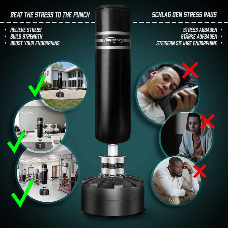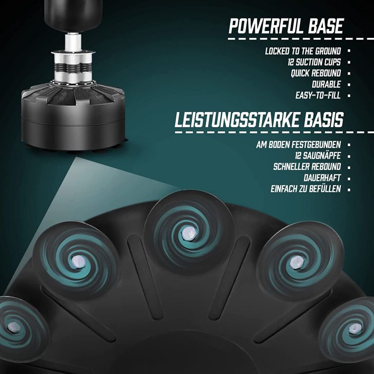 Voľne stojace boxovacie vrece nie je určené iba pre boxerov, ale je skvelým fitness vybavením pre všetkých športovcov a športových fanúšikov, či už sú zbehlí v bojových umeniach, alebo sa len chcú uvoľniť po dlhom dni v kancelárii. S pevnou, stabilnou základňou a spoľahlivým pružinovým mechanizmom je toto boxovacie vrece so stojanom ideálnym riešením, pokiaľ nie je možná montáž na stenu alebo strop. Má silnú prísavnú základňu s 12 prísavkami na upevnenie.