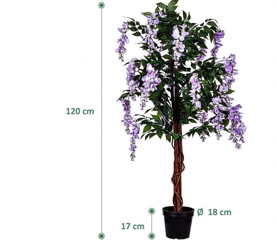 Skutočný drevený kmeň z palmového dreva dotvára realistický vzhľad Vistárie. Umelý stromček sa dodáva v čiernom kvetináči, ktorý je možné ľahko umiestniť do ozdobného kvetináča podľa vlastného výberu.
