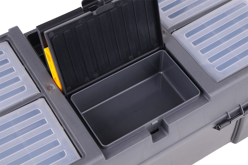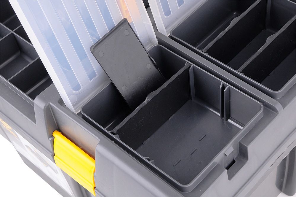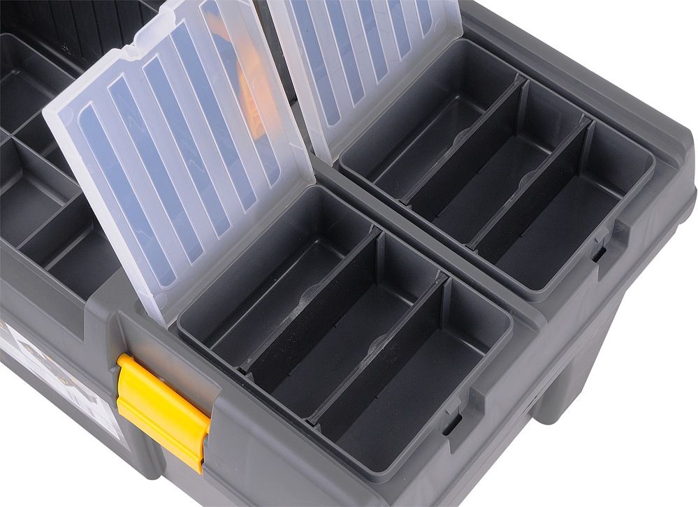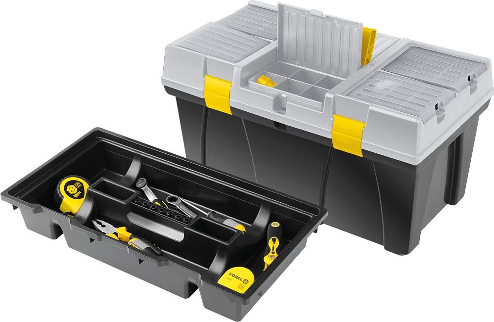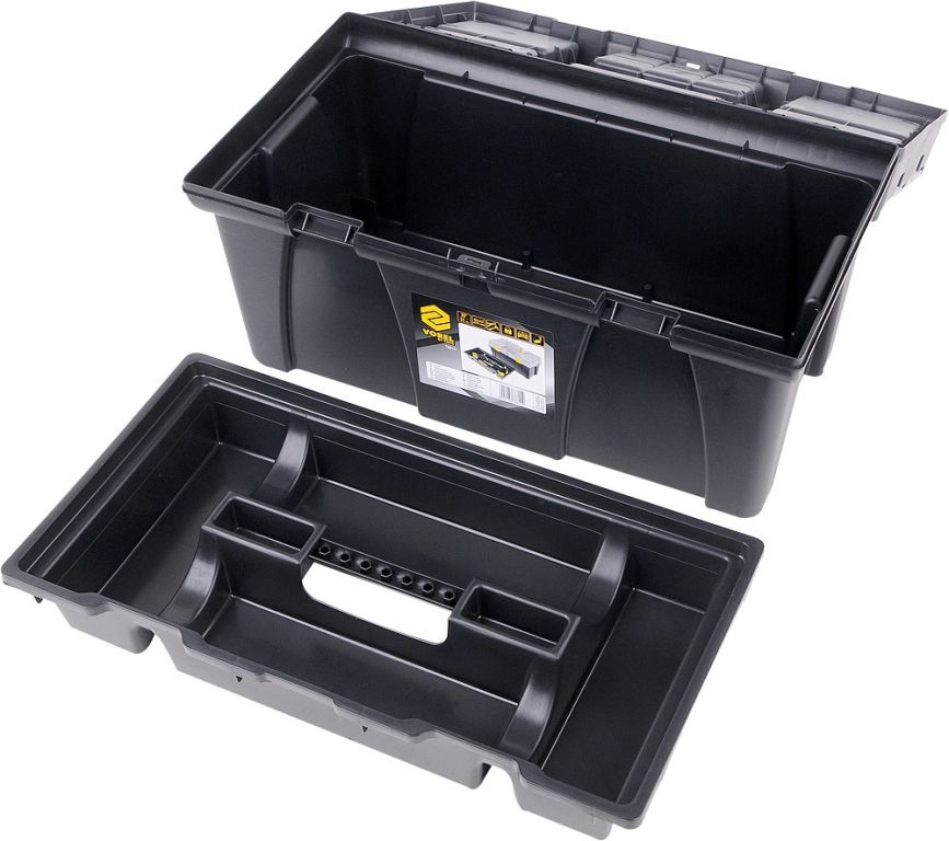 Plastový kufor s dvomi vyberateľnými organizérmi na veku a vnútornou vyberateľnou vložkou na drobné predmety.