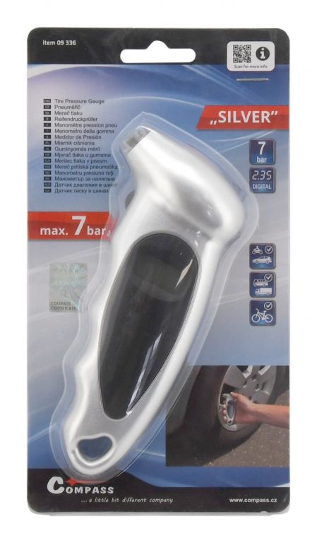 Digitálny pneumerač na meranie tlaku v pneumatikách automobilov. Voliteľne zobrazenie tlaku v jednotkách BAR, kPa, PSI, alebo kg / cm2 (Atm). Rozsah tohto merača je až 7 BAR.