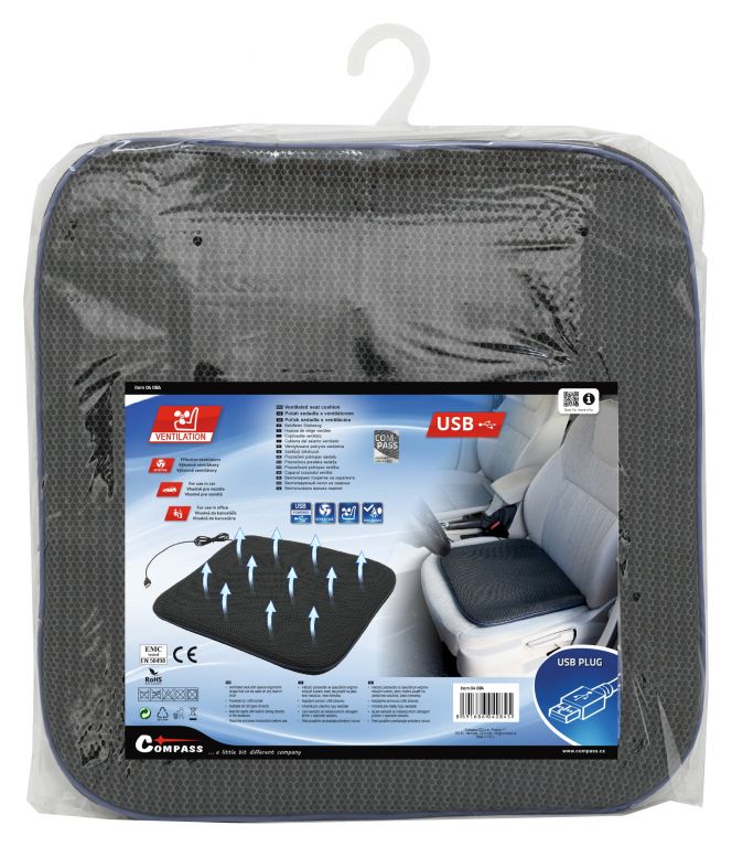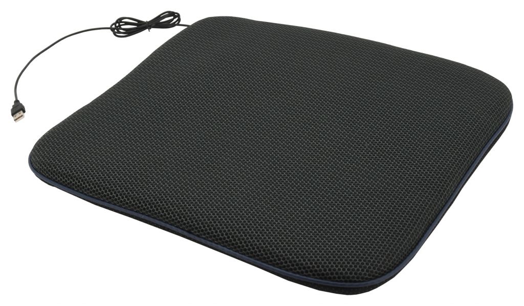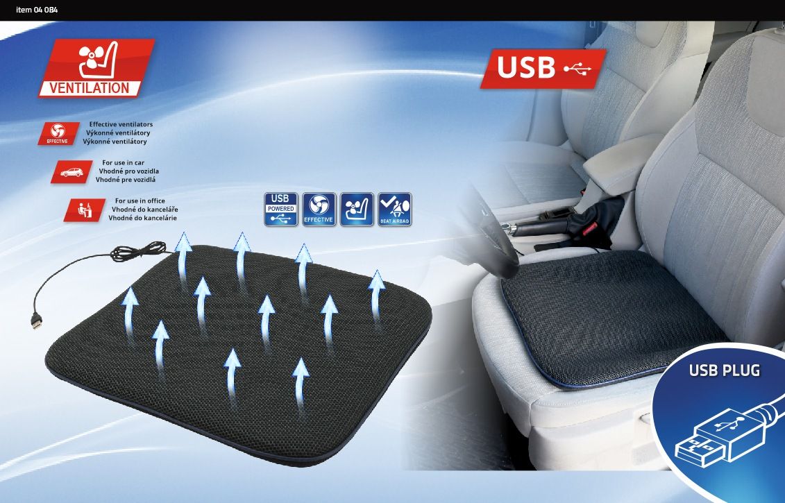 Podsedák z veľmi príjemného materiálu, s ventilátorom a integrovaným senzorom, ktorý spína vetranie v momente zaťaženia (sedenia). Poťah je ideálnym doplnkom v horúcich ročných obdobiach. Napájanie je riešené USB káblom. Podsedák tak stačí položiť na kreslo v kancelárií, vo vozidle alebo inde na miestach s prístupom k USB zásuvke a užiť si príjemné chladenie. Podsedák je možné používať aj vo vozidlách so sedadlami so zabudovaným airbagom.