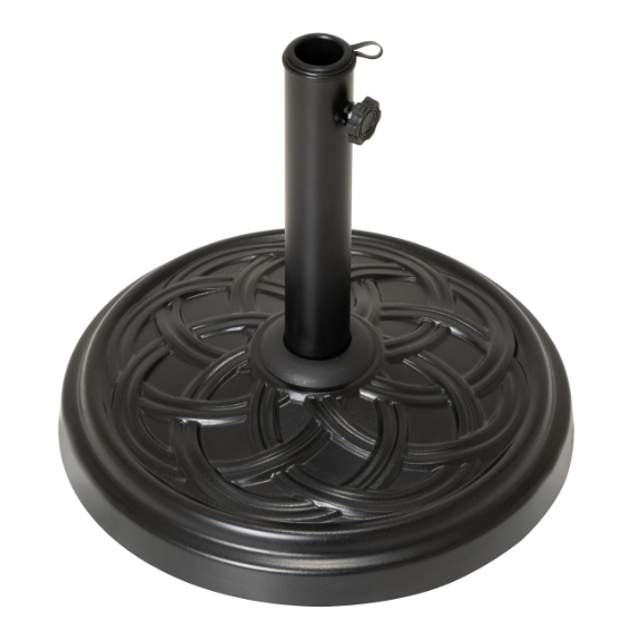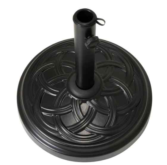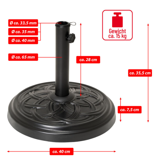 Tento robustný, 15 kg okrúhly podstavec slnečníka vyrobený z betónu plní nielen svoju funkciu bezpečnej podpory pre váš slnečník, ale aj dobre vyzerá a je tiež ľahký a praktický pri používaní. Stojan je potiahnutý načierno a má dekoratívny vzor. Vybavené aretačnou skrutkou, ktorá slnečník fixuje. Ideálne pre vašu terasu alebo balkón. Kruhový tanier má priemer cca 40 cm. Celková výška je cca 35,5 cm. Stojan je so svojimi 15 kg vhodný pre slnečníky do 2 m – nie pre konzolové slnečníky. Všimnite si aj naše ďalšie záhradné veci, ako sú slnečníky, stoly, skladacie stoličky, stohovacie stoličky, lehátka, lavičky z kovu, plastu alebo dreva.