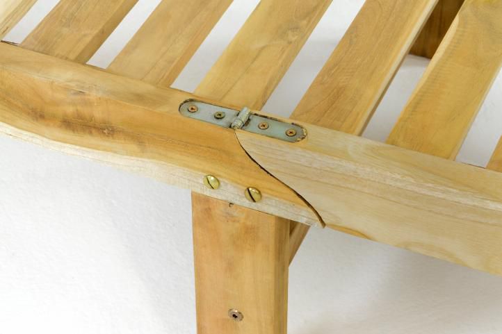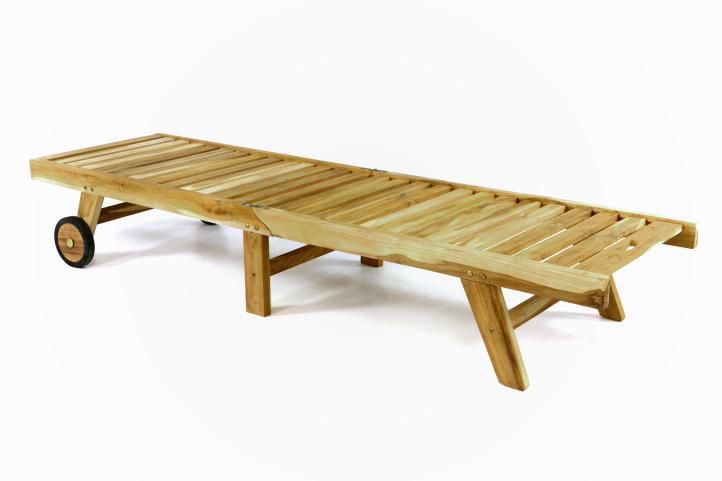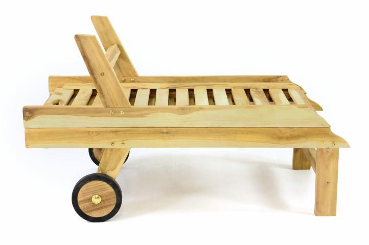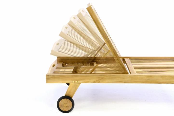 Kvalitné teakové ležadlo s kolieskami potiahnutými gumou a nastaviteľnou opierkou hlavy.