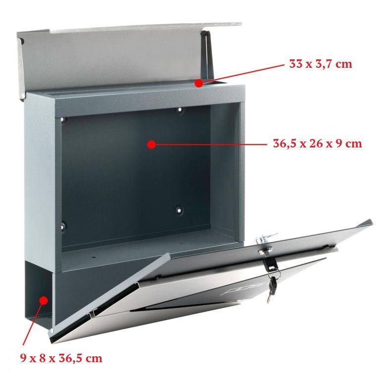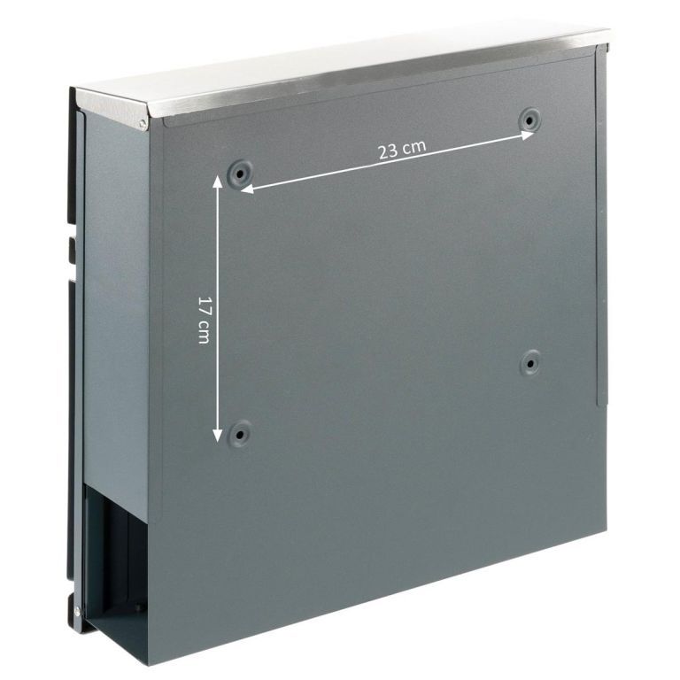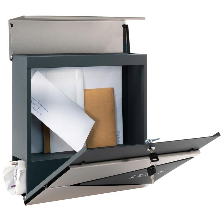 Poštové schránky sú vizitkou každého domu. Poštové schránky nielen prijímajú poštu, ale aj prezentujú Váš životný štýl. Moderná a napriek tomu nadčasová poštová schránka v ušľachtilom dizajne, ktorá Vášmu domovu dodá osobný a individuálny nádych. Pošta sa vhadzuje dovnútra hornej chlopne, v ktorej je zabudovaný slot na listy. Ani veľké listy a časopisy sa nemusia ohýbať. K dispozícii je navyše novinová priehradka, ktorá je po oboch stranách otvorená. Poštová schránka je chránená vačkovým zámkom a vodotesná klapka uzatvára kľúčovú dierku pred nežiadúcimi vplyvmi ako je napr. námraza. Pre vybratie pošty možno kryt otvoriť jednou rukou smerom dopredu. Práškovo lakovaná nerezová oceľ nástennej schránky je vodotesná a nehrdzavejúca, takže Vaše zásielky sú vždy chránené pred vetrom a počasím.