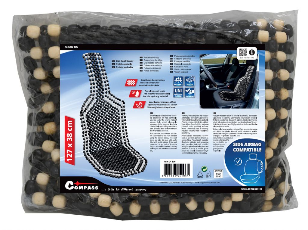 Poťah je vyrobený z drevených guličiek, ktoré príjemne masírujú telo, podporujú krvný obeh, pomáhajú znižovať únavu aj bolestivosť chrbta a umožňujú prúdenie vzduchu medzi sedadlom a chrbtom vodiča. Poťah rozložte na sedadlo a v hornej časti ho upevnite pomocou šnúrok za opierku hlavy. Pokiaľ poťah na sedadlo alebo akákoľvek časť jeho upevnenia nebudú prekrývať vyústenie airbagov v operadle sedadla, je možné poťah použiť aj na sedadlá so zabudovaným bočným airbagom priamo v operadle.