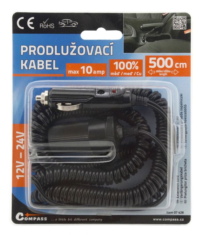 Predlžovací kábel do zásuvky automobilového zapaľovača 12 V alebo 24 V. Kábel je vyrobený z kvalitných komponentov, najmä vodičov.