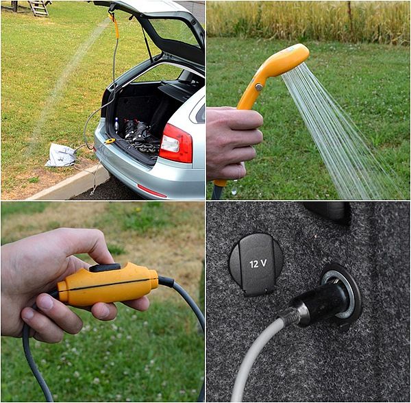 Prenosná sprcha s čerpadlom, s vypínačom a so zástrčkou do zásuvky automobilového zapaľovača.