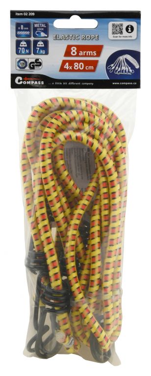 Kvalitné pružné upínače zakončené kovovými hákmi sa hodia do každej situácie. Prevedenie typu pavúk disponuje 8 prameňmi s hákmi (zostava 4 kusov spojených krúžkom). Homologácia TÜV / GS.
