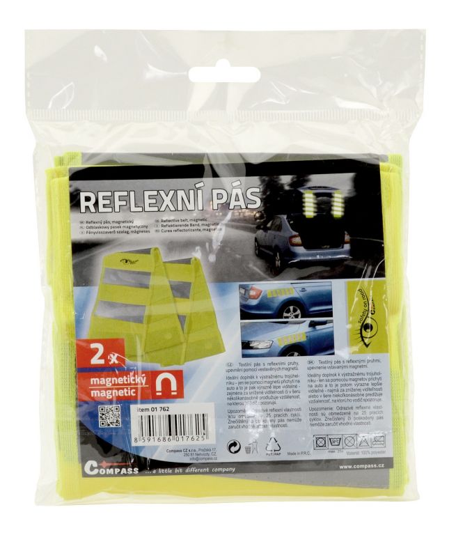 Textilný pás s reflexnými pruhmi upevneníte pomocou vstavaných magnetov. Vhodný najmä za zníženej viditeľnosti alebo v šere. Reflexný pás niekoľkonásobne zvyšuje šancu, že Vás iný vodič spozoruje v čas.