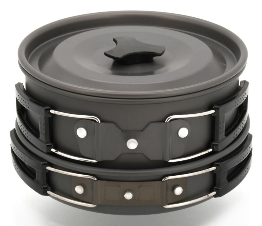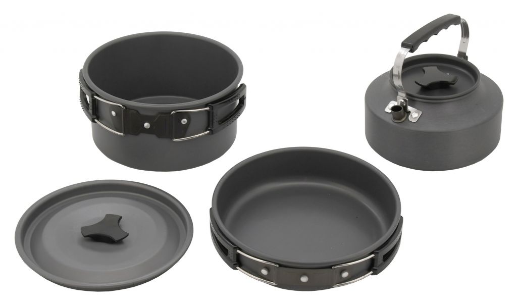 Sada je tvorená panvičkou 18 x 4 cm, kotlíkom 17 x 9 cm, kanvicou 15 x 7,5 cm a vekom s priemerom 17 cm. Všetko vybavenie má sklápací držiak zakončený plastovou rukoväťou pre uľahčenie manipulácie. Jednotlivé časti sady sú rozmerovo presne odstupňované a dajú sa tak zložiť dohromady, čím ušetria veľa miesta. Navyše je všetko uložené v praktickej sieťovanej taške. Sada je vhodná pri turistických a ďalších outdoorových aktivitách, kedy chceme zabezpečiť patričný komfort a zároveň ušetriť miesto a váhu batožiny.