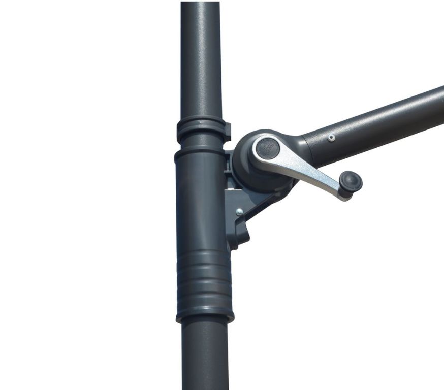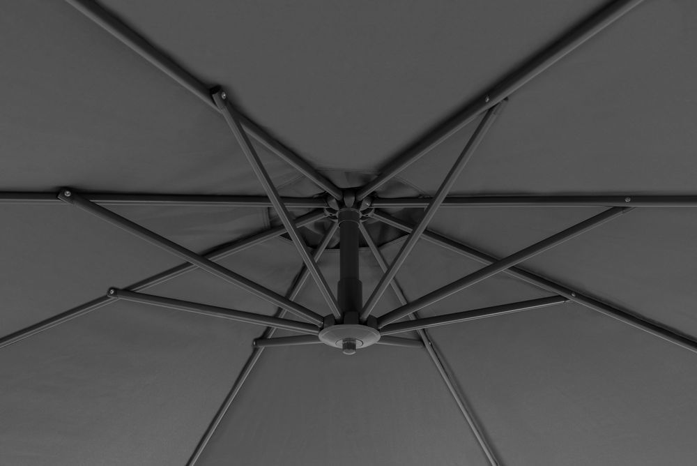Súčasťou slnečníka je krížový podstavec, ktorý je potrebné zaťažiť dlaždicami. Slnečník sa veľmi jednoducho ovláda. Otvára sa pomocou kľučky, je možné nastaviť u neho uhol tienenia jednoduchým posunutím po stojnej tyči. Zároveň je tu aj možnosť otáčania o 360 ° za pomoci pedálu. Poťah má vodoodpudivý nástrek, ktorý Vás ochráni pred miernym dažďom. S PODSTAVCOM