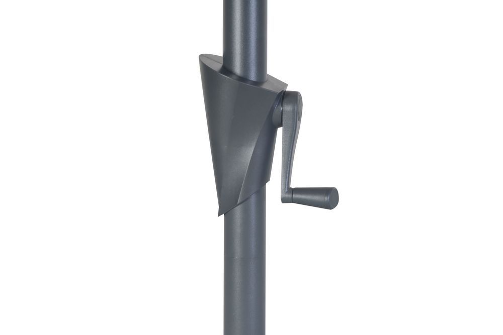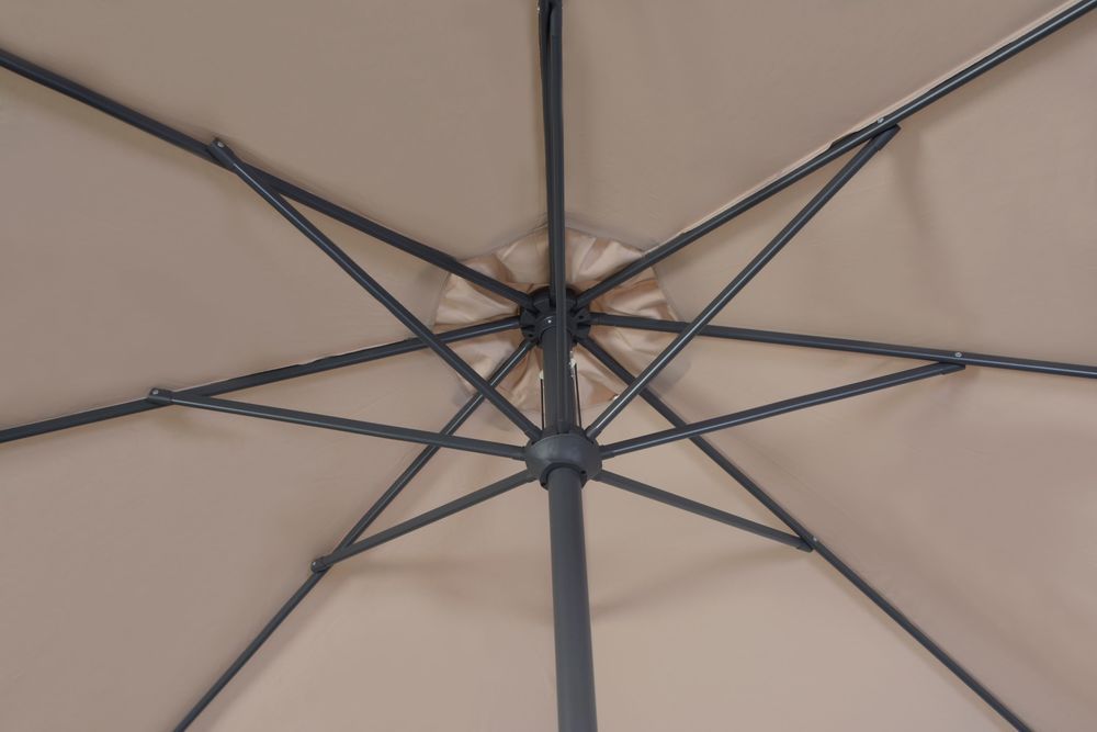Veľký, priestranný, osemramenný slnečník s moderným dizajnom a pevnou kovovou konštrukciou. Otváranie za pomoci dizajnovej kľučky, poťah má vodoodpudivý nástrek, ktorý Vás ochráni pred miernym dažďom. Slnečník je bez možnosti naklápania. BEZ PODSTAVCA