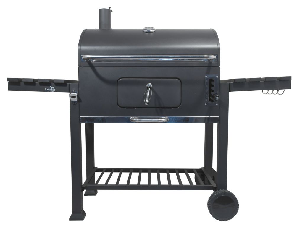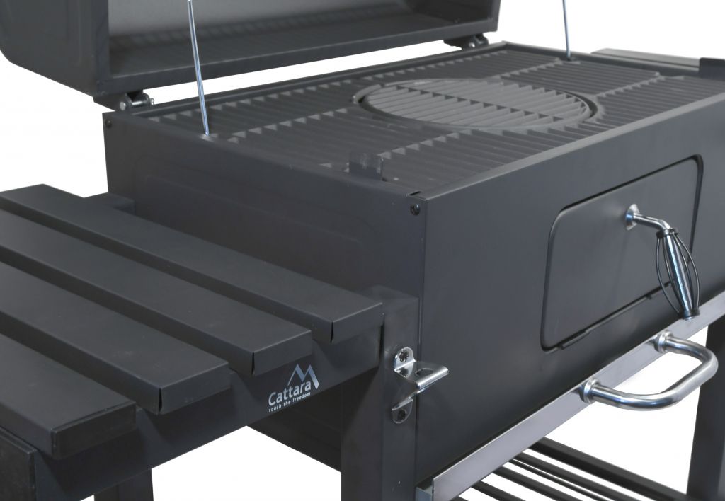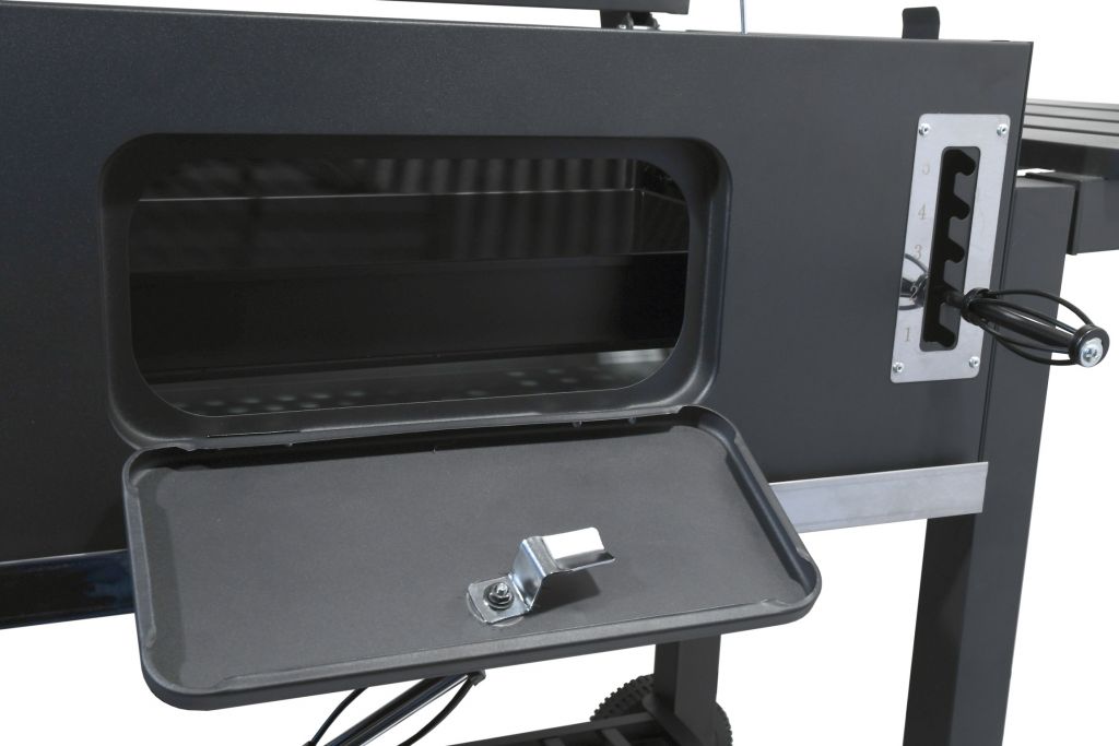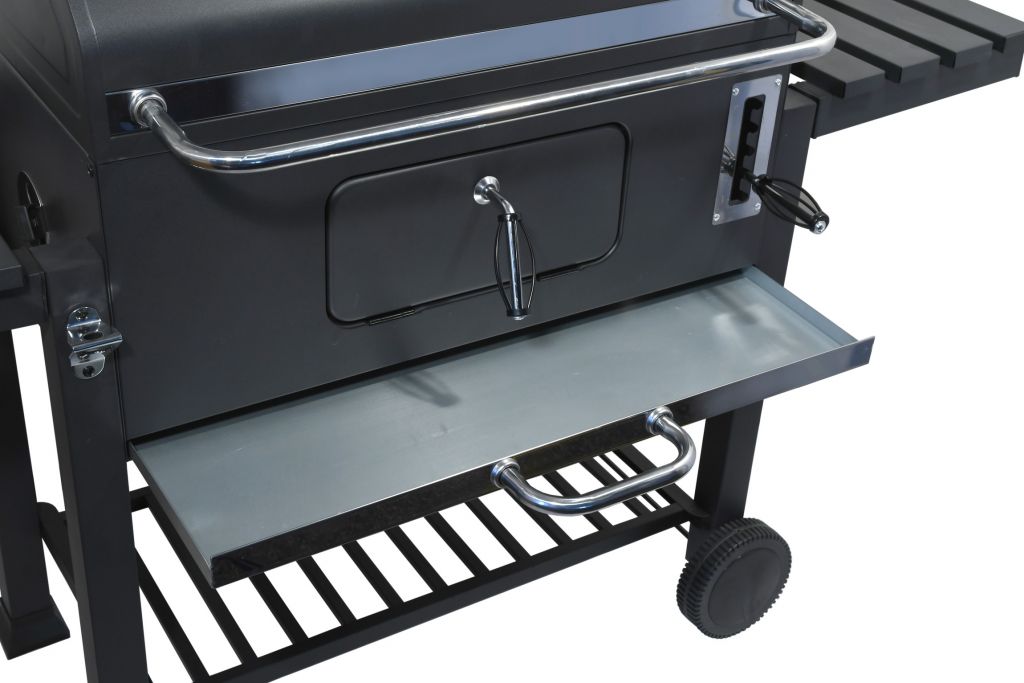 ROYAL GRANDE XXL je najväčší gril z radu ROYAL grilov na drevené uhlie pre najnáročnejších užívateľov. Vysoko stabilná konštrukcia z precízne opracovanej ocele je opatrená odolnou, hrubo čiernou farbou. Konštrukcia je doplnená 2 x kolieskami uľahčujúcimi mobilitu grilu. Rám v spodnej časti slúži na ďalšie zvýšenie stability a rovnako ako odkladací priestor. Na bočné strany sú doplnené skladacie poličky na odkladanie rozličného vybavenia na grilovanie, alebo odkladanie samotných pokrmov. Ovládacie kovové prvky a rukoväte majú dostatočné rozmery pre pohodlný úchop a zaisťujú ľahkú manipuláciu. Obojstranná oceľová regulácia ventilácie perfektne lícuje s konštrukciou. Vyklápacie veko je vo vrchnej časti doplnené komínom a navyše je opatrené teplomerom pre stálu kontrolu teplôt vo vnútri grilu. Pre samotnú tepelnú prípravu Vašich pochutín je gril opatrený robustným, trojdielnym, liatinovým roštom s okrúhlym stredom. Miesto strednej časti je po vybratí možné umiestniť napr. grilovacie panvice, pizza kameň a podobné (priemer 28-29 cm). Ďalej je grilovací priestor osadený odkladacím roštom na udržanie teploty už hotových pokrmov, alebo na ich predhriatie. Ďalšou prednosťou grilu je rošt na uhlie s nastaviteľnou výškou, grilovací priestor je tak možné regulovať pomocou mechanizmu na prednej strane, podľa požiadaviek daných pokrmov. Dvierka na čelnej strane grilu významne uľahčujú dopĺňanie uhlia. Na uľahčenie čistenia je potom určená zásuvka na popol v najspodnejšej časti grilovacieho priestoru.