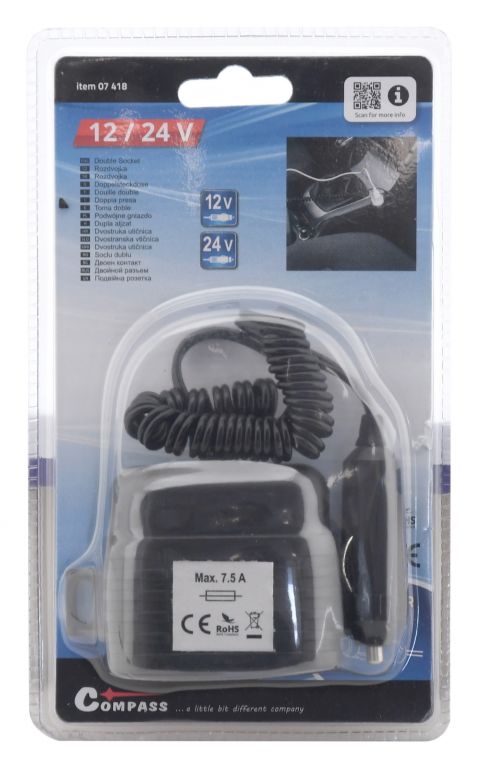 Rozdvojka zásuvky automobilového zapaľovača 12 V alebo 24 V. Umožňuje pripojenie dvoch spotrebičov k jednej štandardnej zásuvke zapaľovača v automobile. Poteší každého vodiča.