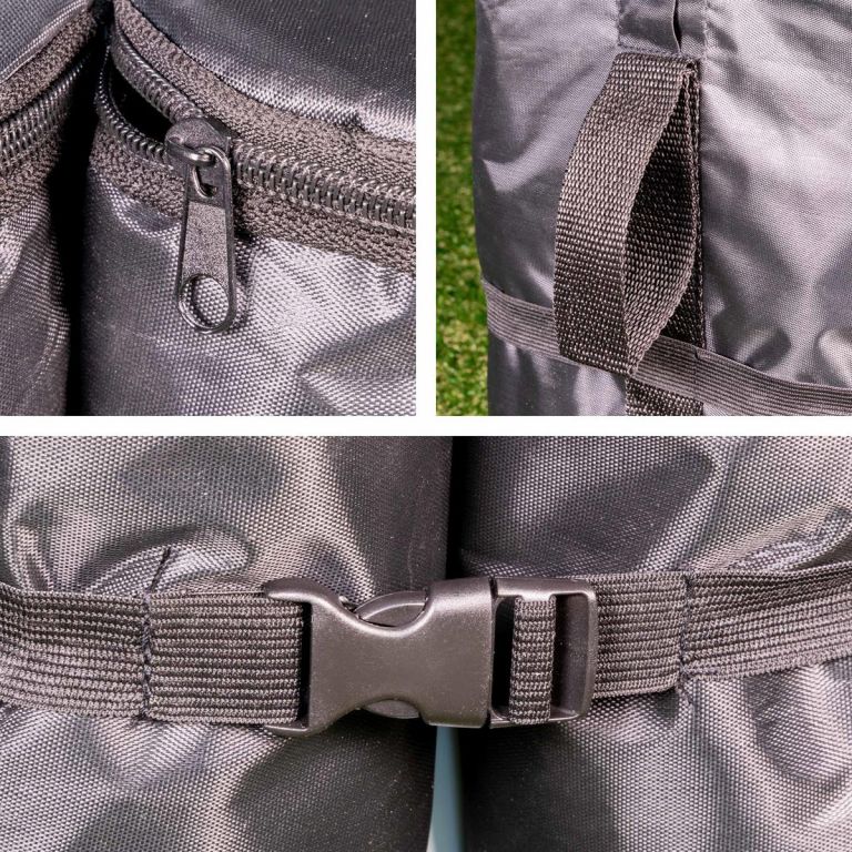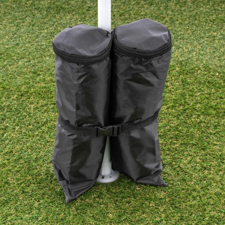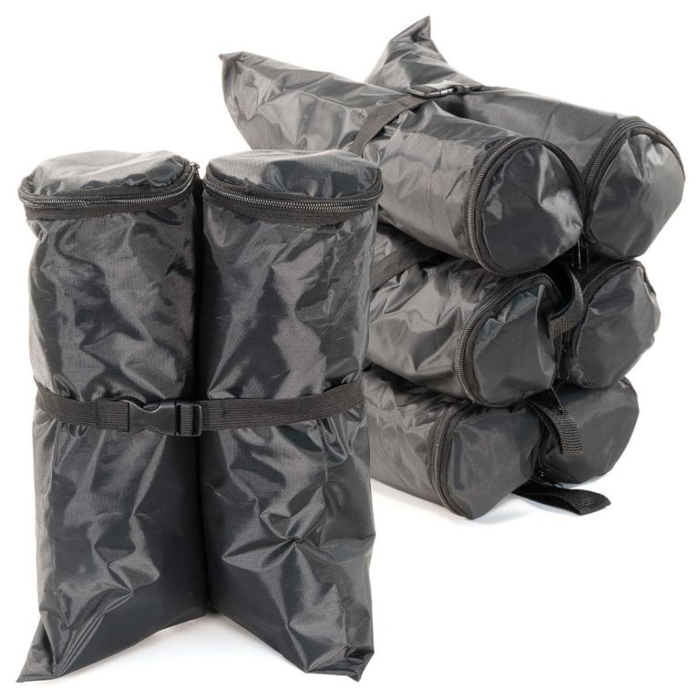 Táto sada 4 ks záťažových manžiet zaisťuje optimálnu stabilitu vášho stanu. 4 prvky, z ktorých sa každý skladá z 2 vriec, ktoré sa pripevňujú priamo na stojnú nohu. Vrecia možno ľahko naplniť pieskom a bezpečne uzavrieť zipsom. Každé vrece možno naplniť 4 kg piesku tj. max. plniaca kapacita je 32 kg. Hmotnostné vaky sú vyrobené z robustnej, vodeodolnej polyesterovej tkaniny a sú preto predurčené na vonkajšie použitie. Ľahko sa udržujú a vďaka svojej kompaktnej veľkosti ich je možné dobre uskladniť. Zabezpečenie stojných nôh konštrukcie je nevyhnutným doplnkom kotvenia vonkajších markíz alebo skladacích stanov. Plniaci piesok nie je súčasťou balenia.