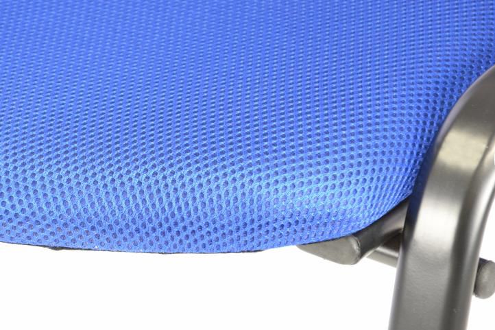 Kancelárska stohovateľná stolička s čalúneným modrým sedákom.