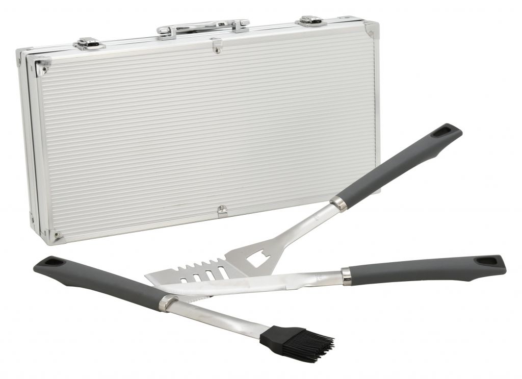 V sade sa nachádza obracačka s precízne zabrúsenou hranou vybavená vlnitým ostrím, otváračom zátok a otvormi pre odtok. Kliešte, špeciálne tvarované pre istý úchop najrôznejších pokrmov, kefa pre údržbu grilu, kedy samotná kefová časť je z mosadze. Nevyhnutnou časťou grilovacieho náradia je aj dvojzubá vidlička, štetec so štetinami z nylonu pre potieranie pokrmov, porcovací nôž a 4 grilovacie ihlice s hrotmi brúsenými do špičky. Všetko náradie je dizajnovo jednoduché a nie je nijak zbytočne tvarované, čo významne uľahčuje čistenie. Grilovacie náradie je navyše doplnené o pohodlné silikónové rukoväte a všetky nástroje možno zavesiť za háčiky. Sada je úhľadne umiestnená v transportnom kufri, hodí sa najmä pre náročnejších užívateľov, jej prehľadnosť a rozsah rôznych nástrojov však ocení ktokoľvek.
