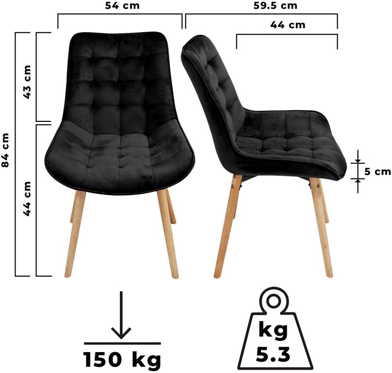 Jedálenské stoličky sú vyrobené zo zamatu. Čalúnenie Vám zabezpečí pohodlie a prešívanie dodá stoličkám ten správny dizajn. Nohy z bukového dreva zaisťujú skvelú stabilitu. Vďaka dizajnu je stolička vhodná nielen do kuchyne. Záleží len na Vás kam si stoličku umiestnite.