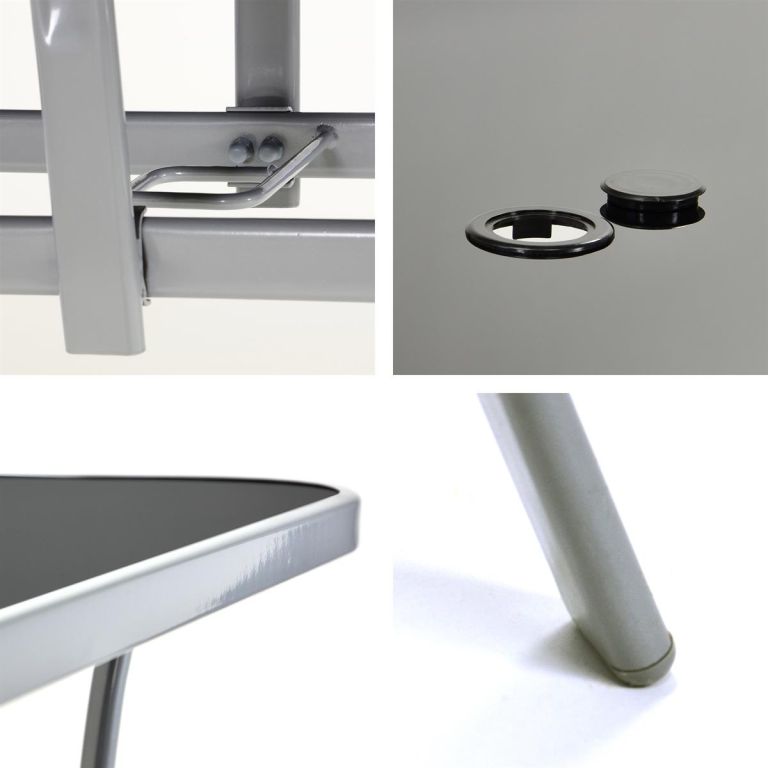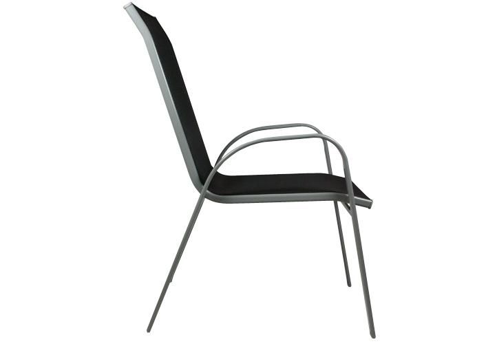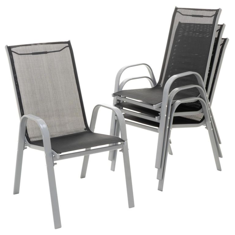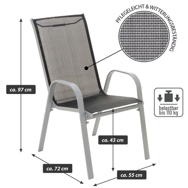 Záhradný nábytok s lakovanou oceľou. Idálny pre použitie v interiéri, ale aj v exteriéri. Sedák a operadlo stoličiek je vyrobené z elastickej textílie vo farbe antracit. Pre príjemné posedenie stoličky obsahujú područky. Pokiaľ stoličky práve nepoužívate, nie je nič jednoduchšie ako ich nastohovať na seba a dať ku stene či do kúta. Použité materiály sú bezúdržbové, odolné voči poveternostným vplyvom a materiály nevyžadujú špeciálnu starostlivosť. Kov má práškový nástrek a nohy majú plastovú povrchovú úpravu. Sklenený stôl je elegantný a ľahko sa čistí.