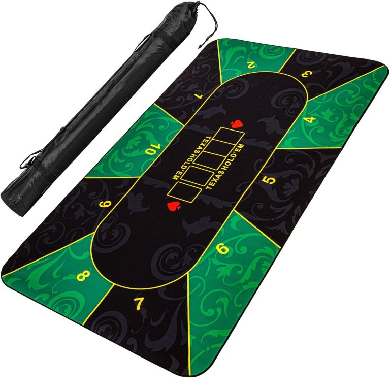 Pokerová podložka je vhodná až pre 10 hráčov. Predná strana je vyrobená z vodoodpudivého polyamidu a materiál je príjemne mäkký a hladký na dotyk (podobne ako podložka pod myš). Zadná strana je vyrobená z protišmykového prírodného kaučuku - gumový povlak zabraňuje skĺznutiu podložky. Podložku môžete zrolovať, aby sa ušetrilo miesto a vďaka priloženej taške ju vezmete jednoducho kamkoľvek.