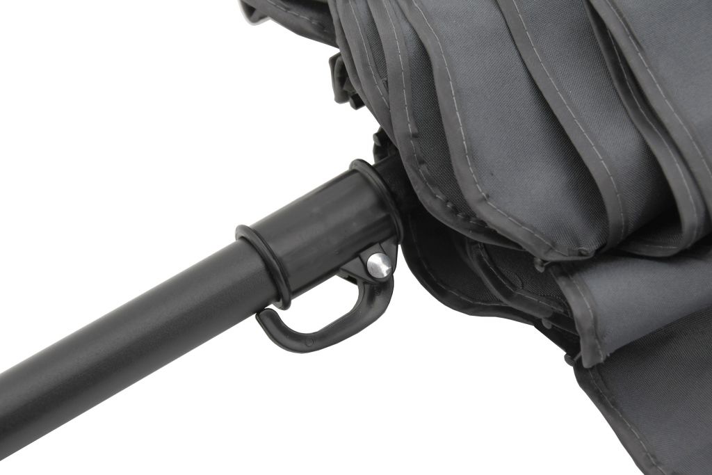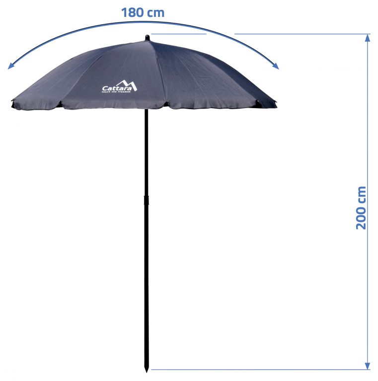 Dĺžka "polomeru" slnečníka je 180 cm a celková výška 200 cm. Dvojdielna konštrukcia je skladná a ľahko zložiteľná. Stačí do seba zasunúť obe nosné tyče a zaistiť páčkou. Potom už stačí len roztiahnuť samotný slnečník. Konštrukcia slnečníka má špicaté zakončenie, takže je vhodná pre zapichnutie do zeme.
