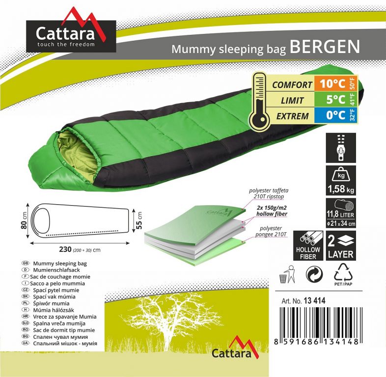 Spací vak múmia Bergen je spacákom, ktorý dokonale kopíruje telo a má tak najlepšie tepelnoizolačné vlastnosti a je vybavený sťahovacou kapucňou chrániacou hlavu. Na komfort a teplotu vo vnútri spacieho vaku má vplyv oblečenie. Spánok je doporučený len v spodnom prádle, prípadne s tričkom. Je totiž dôležité vyhriať si spacák a zbytočne neohrievať oblečenie. Spacák Bergen je vybavený tromi vrstvami. Duté vlákna zadržujú veľké množstvo vzduchu a zaisťujú rýchly odvod vlhkosti a zároveň majú výborné izolačné vlastnosti. Spacáky vyberáme hlavne podľa ich teplotných limitov, kde Comfort značí teplotu, pri ktorej nám bude príjemne, Limit je teplota, pri ktorej ešte budeme v teple a v neposlednom rade je tu teplota Extrem, ktorá udáva maximálnu únosnú teplotu.