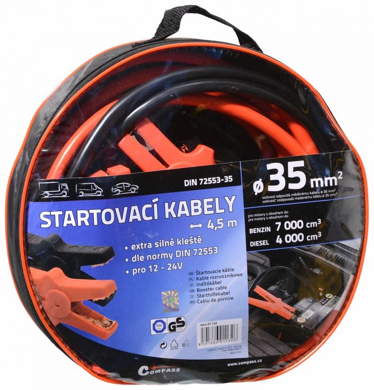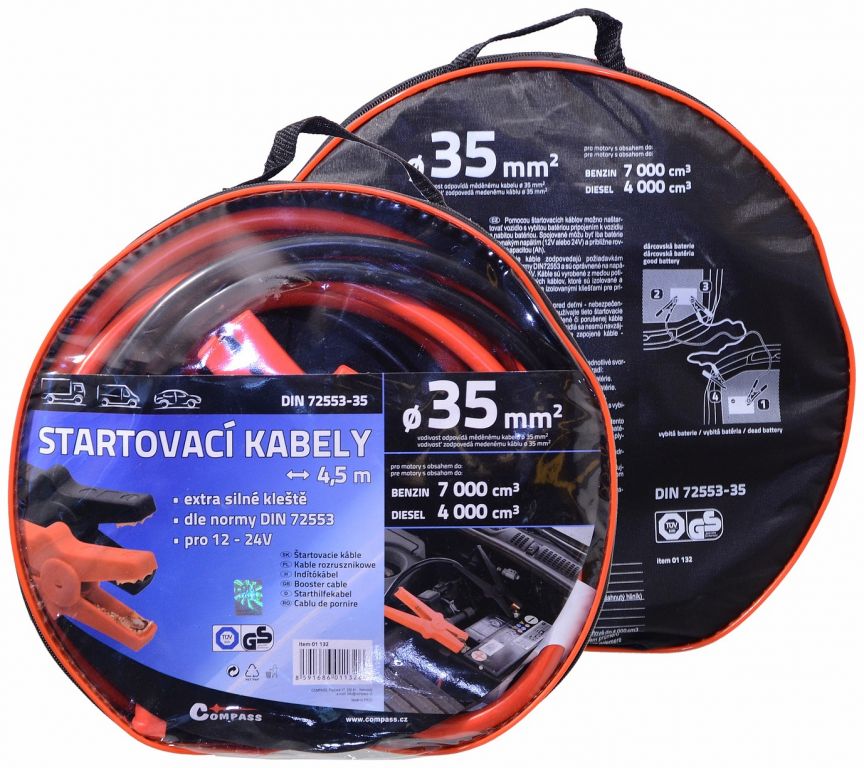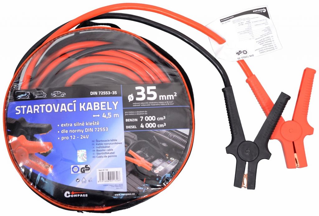 Tieto štartovacie káble sú určené na núdzové štartovanie vozidiel s benzínovým motorom do objemu 7000 cm3 alebo s naftovým motorom do 4000 cm3. Dĺžka 4,5 metra, vodivosťou zodpovedá medenému káblu s priemerom 35 mm2. Vysoko kvalitné štartovacie káble zodpovedajú požiadavkám európskej normy DIN 72553-35 a sú oprávnené na napätie od 12 V do 24 V. Káble sú vyrobené z medí potiahnutých hliníkových káblov, ktoré sú izolované a vybavené kompletne izolovanými kliešťami na pripojenie k akumulátoru. Pomocou štartovacích káblov je možné naštartovať vozidlo s vybitou batériou pripojením k vozidlu s nabitou batériou. Spájané môžu byť iba batérie s rovnakým napätím ( 12 V alebo 24 V ) a približne rovnakou kapacitou ( Ah ).