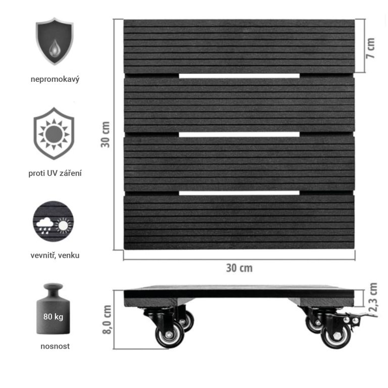 Podstavec na rastliny je vyrobený z vodoodpudivého materiálu WPC odolného proti poveternostným vplyvom, a je preto vhodný pre vnútorné aj vonkajšie použitie. Podstavec je odolný proti UV žiareniu má rebrovaný povrch, ktorý poskytuje optimálnu oporu pre kvetináč umiestnený na podstavci. Vďaka nej môžete rastliny v kvetináčoch ľahko a flexibilne premiestňovať, či už chcete pod nimi upratať, zmeniť umiestnenie v miestnosti alebo chrániť rastliny pred zmenou počasia.