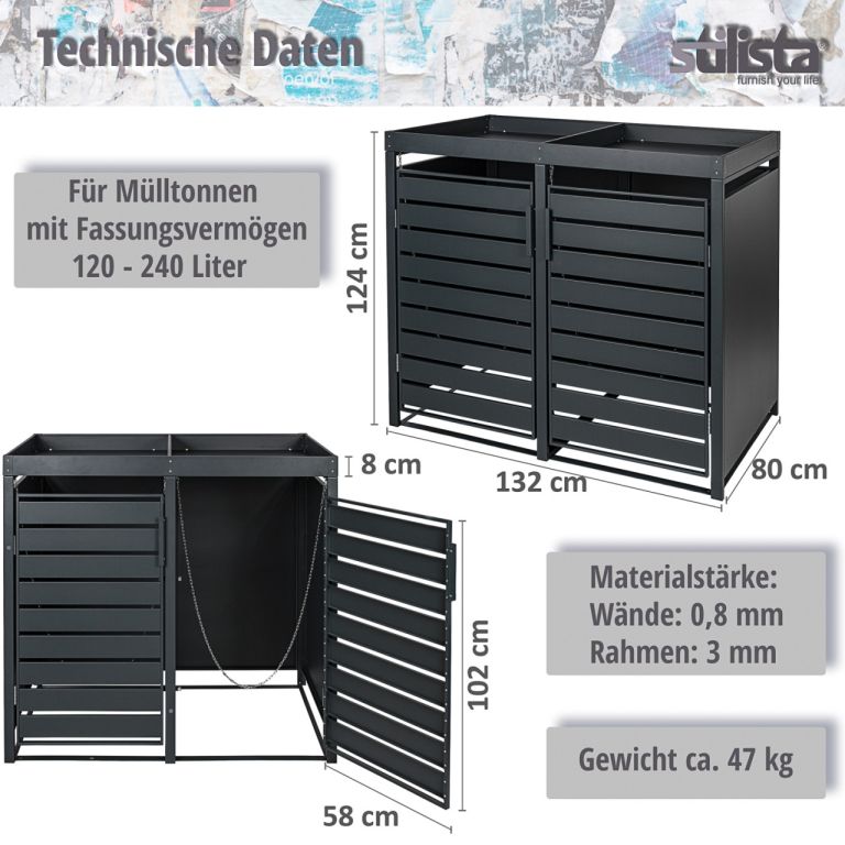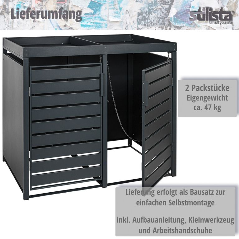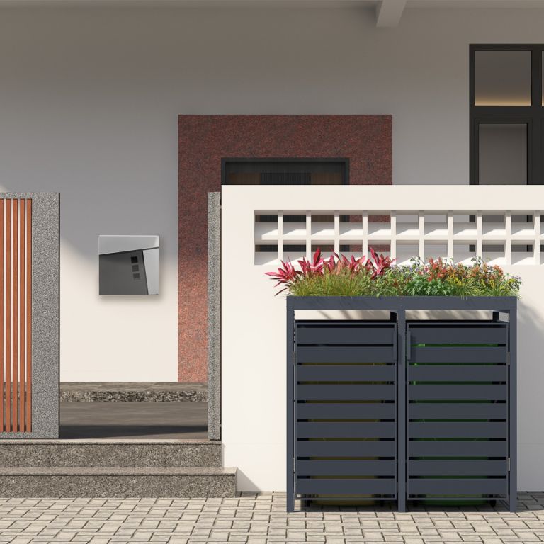 Skriňa STILISTA pre odpadové nádoby ponúka priestor pre štyri odpadkové koše s objemom až 240 litrov. Vďaka priehradkám na rastliny na streche boxu na odpadky si ho môžete skrášliť podľa svojich predstáv. Odtokové otvory na streche pre rastliny umožňujú lepší odtok vody, takže kvetom a bylinkám nehrozí podmáčanie. Užitočné vetracie štrbiny umožňujú cirkuláciu vzduchu a zabraňujú vzniku nepríjemných pachov v kryte. Skriňa na odpadové nádoby je k dispozícii pre jeden, dva, tri alebo štyri odpadkové koše.