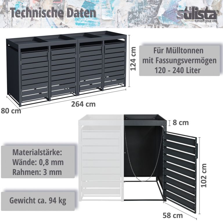 Táto skriňa pre 4 popolnice ponúka priestor pre štyri až 240 litrové odpadové nádoby.
