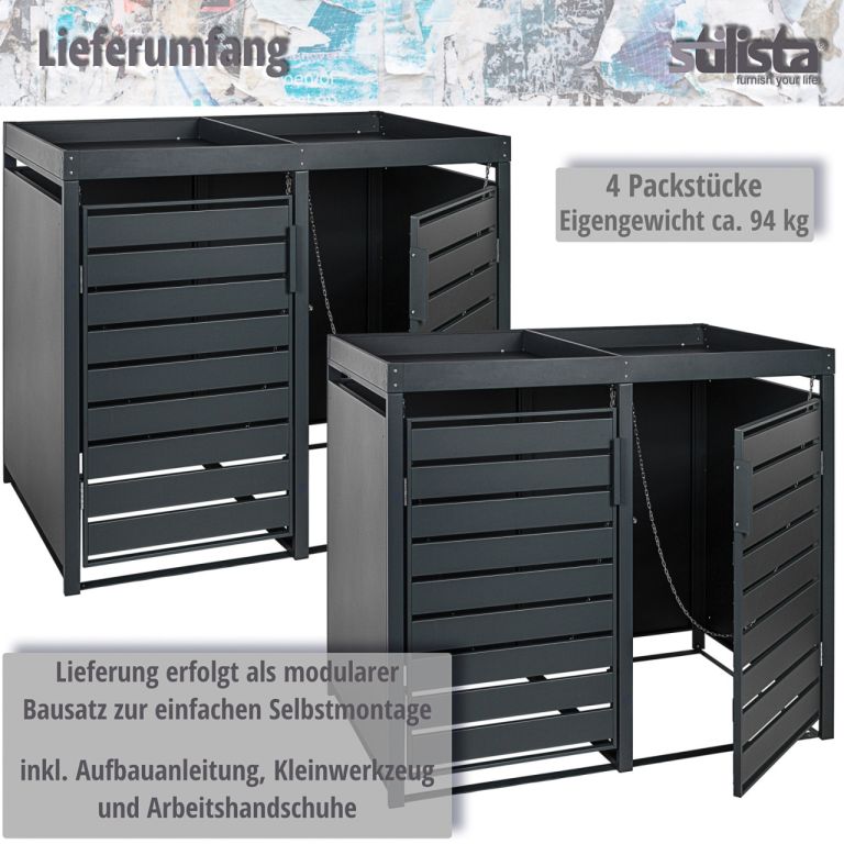 Skriňa STILISTA pre odpadové nádoby ponúka priestor pre štyri odpadkové koše s objemom až 240 litrov. Vďaka priehradkám na rastliny na streche boxu na odpadky si ho môžete skrášliť podľa svojich predstáv. Odtokové otvory na streche pre rastliny umožňujú lepší odtok vody, takže kvetom a bylinkám nehrozí podmáčanie. Užitočné vetracie štrbiny umožňujú cirkuláciu vzduchu a zabraňujú vzniku nepríjemných pachov v kryte. Skriňa na odpadové nádoby je k dispozícii pre jeden, dva, tri alebo štyri odpadkové koše.