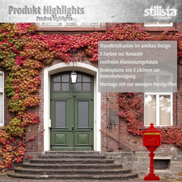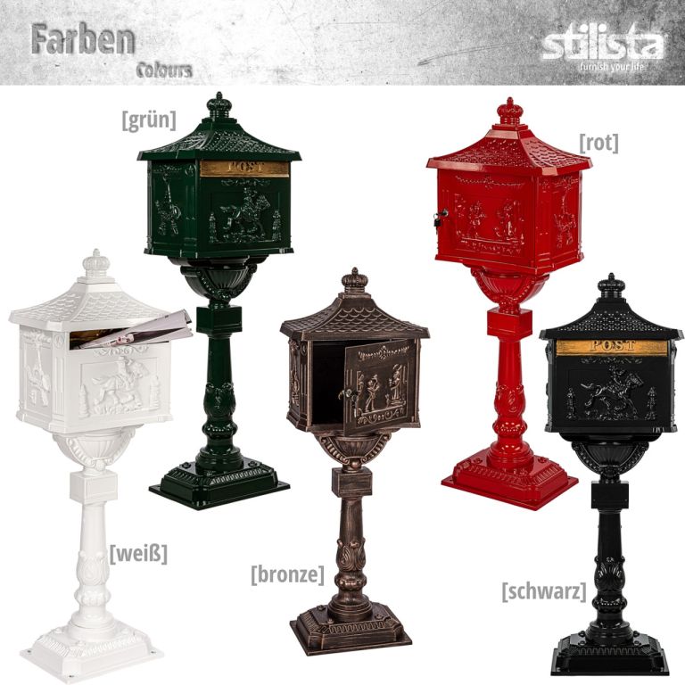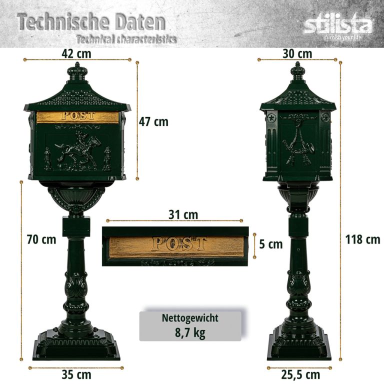 Táto poštová schránka je vyrobená z vysoko kvalitného hliníka odolného proti korózii a poveternostným vplyvom a ponúka dokonalú kombináciu robustnosti a funkčnosti. Stĺpová poštová schránka zaujme nielen nostalgickým vzhľadom, ale aj dlhou životnosťou. Náter odolný voči poveternostným vplyvom zároveň zaisťuje, že domová poštová schránka ponúka optimálnu ochranu aj za dažďa, snehu alebo intenzívneho slnečného žiarenia. Elegantný dizajn s umeleckým zdobením dodá vášmu vstupnému priestoru nadčasovú estetiku. Poštová schránka vo vintage štýle je k dispozícii v rôznych klasických farbách vrátane bronzovej, čiernej, zelenej, červenej a bielej. Poštovú schránku tak môžete dokonale prispôsobiť svojim individuálnym preferenciám a súčasnej koncepcii dizajnu. Krabička v klasickom štýle poskytuje dostatok priestoru pre vaše listy a zaisťuje, že zostanú v bezpečí. Vďaka pevnej konštrukcii a kvalitným materiálom sa môžete tešiť na dlhodobé používanie bez kompromisov v kvalite.